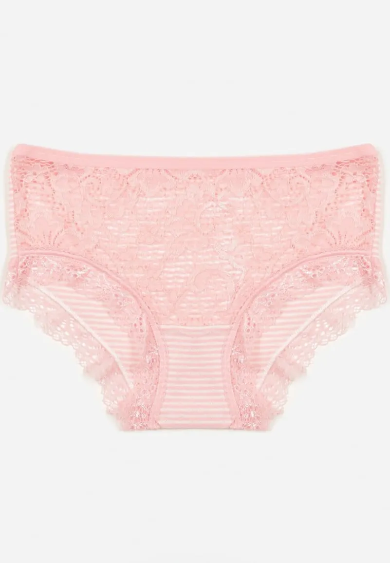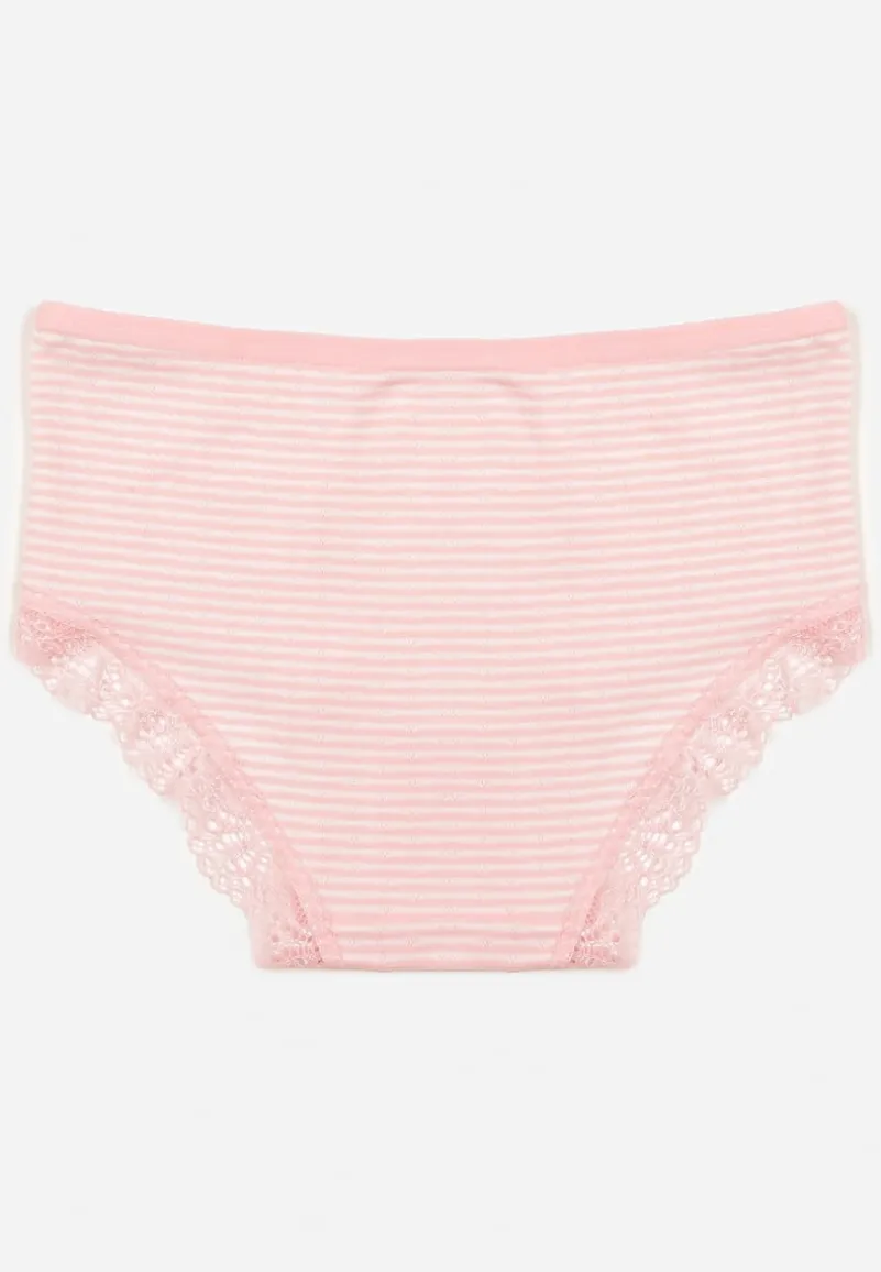 Majtki typu figi Kathrin wykonane z bawełny. Z przodu ozdobione koronką w kwiatki, a z tyłu cienkimi paskami. Będą świetne na co dzień!