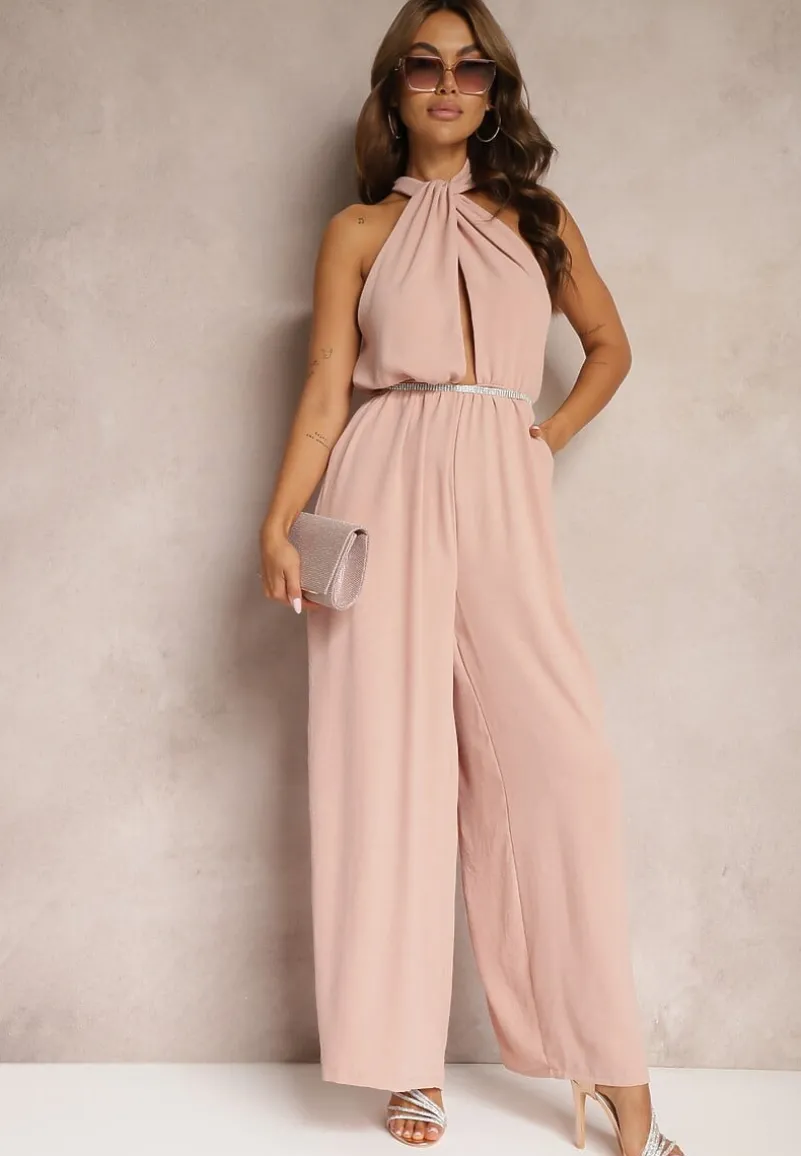 Różowy Taliowany Kombinezon ze Ściągaczem w Talii i Wiązaniem przy Szyi Rivasiris