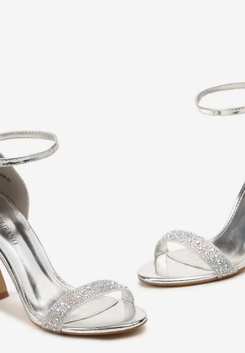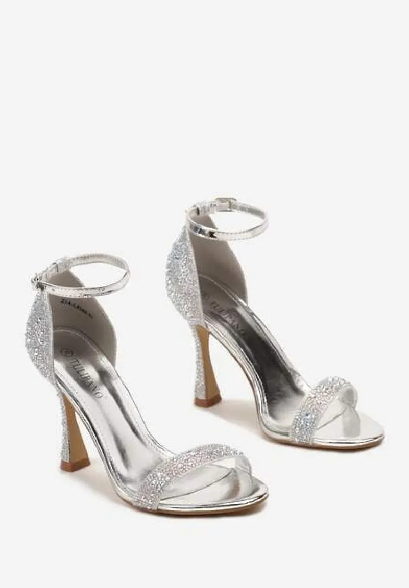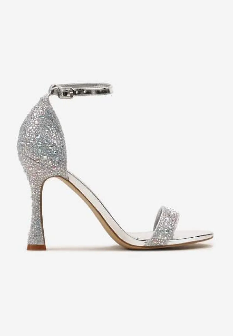 Srebrne Brokatowe Sandały na Klepsydrowej Szpilce z Drobnymi Cyrkoniami Isoldis