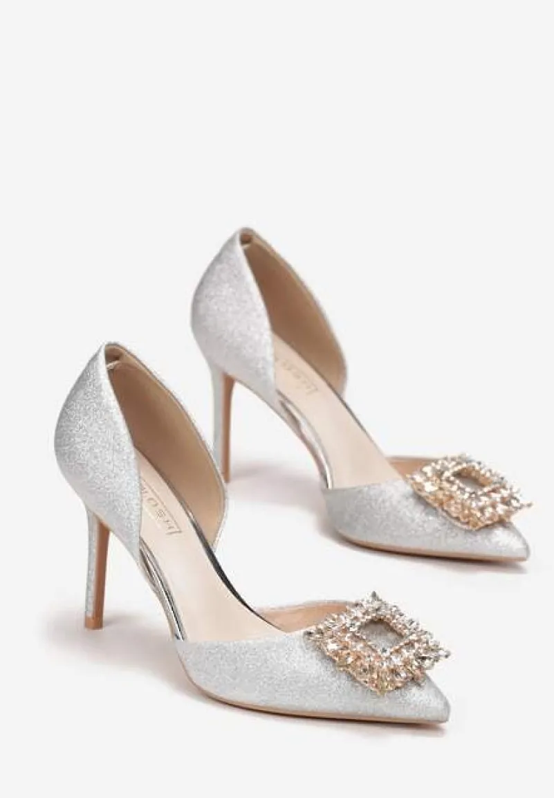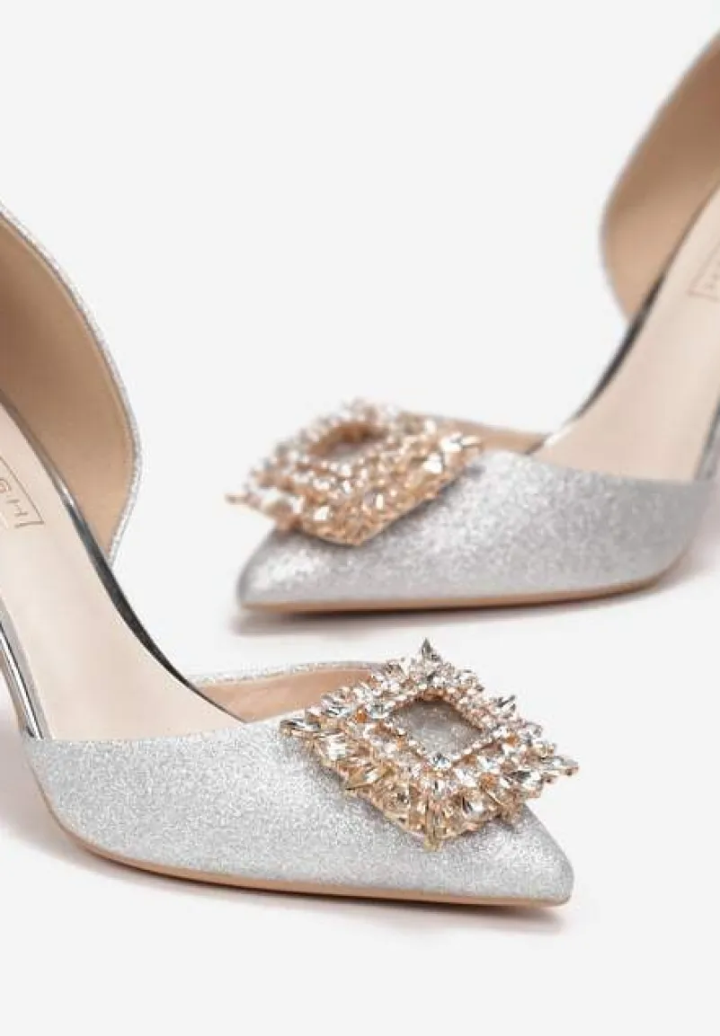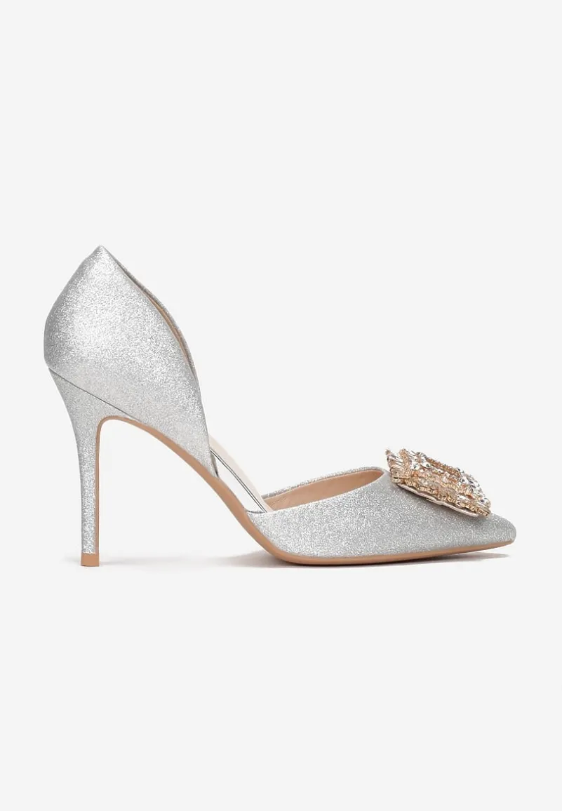 Srebrne Brokatowe Szpilki z Metalową Ozdobą z Cyrkonii Acani