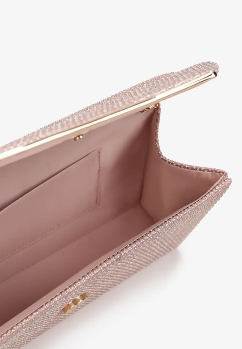 Torebka Hannelore o fasonie klasycznej kopertówki. Zawieszona na pasku z łańcuszka. Ozdobiona brokatem.