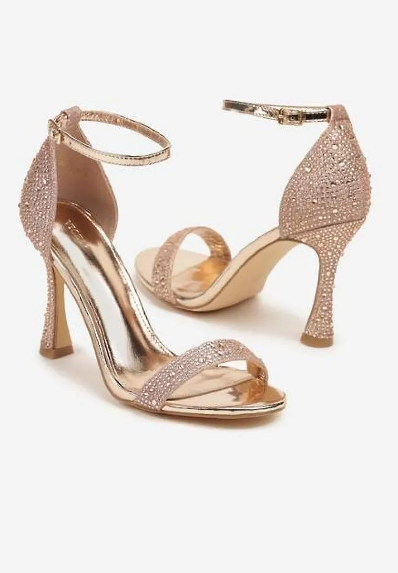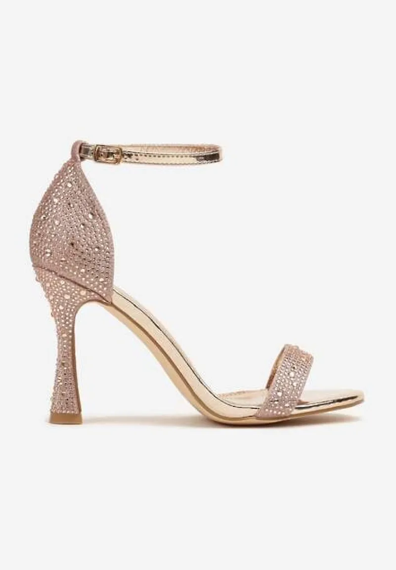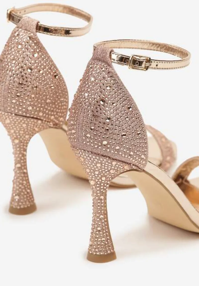 Szampańskie Brokatowe Sandały na Klepsydrowej Szpilce z Drobnymi Cyrkoniami Isoldis