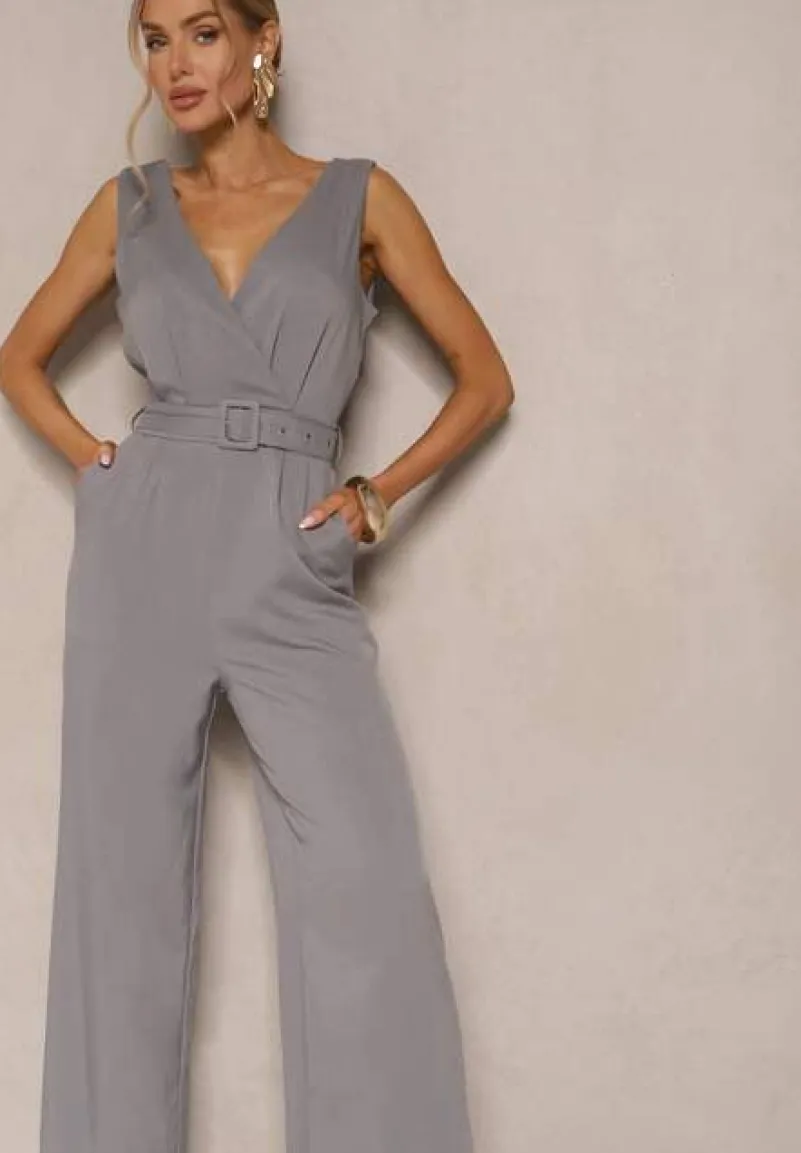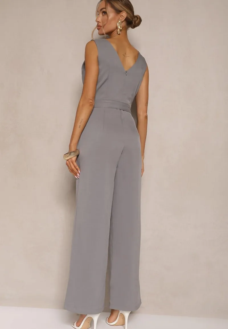 Szary Kombinezon z Długimi Spodniami Kopertowy z Paskiem w Talii Ronasia