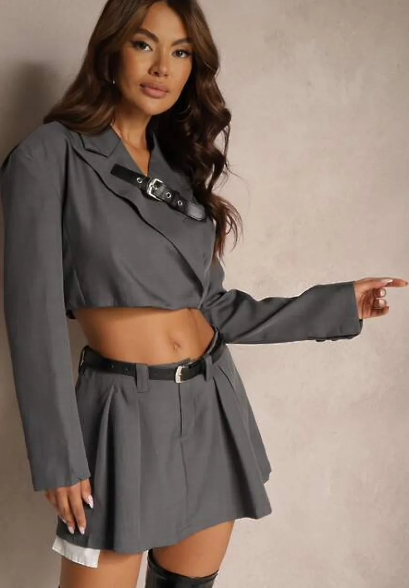Komplet garniturowy Sarivia to doskonały wybór dla odważnej kobiety, która pragnie podkreślić swój styl. Marynarka typu crop na napy z paskiem doda nowoczesnego akcentu, idealny na przejściowy sezon. Spódnico-spodenki na suwak o klasycznej linii świetnie sprawdzą się na codzienne wyjścia — zestaw je z sneakersami i minimalistycznym plecakiem. Na formalne okazje dodaj eleganckie szpilki i subtelną biżuterię, aby olśnić wszystkich swoim wyglądem.