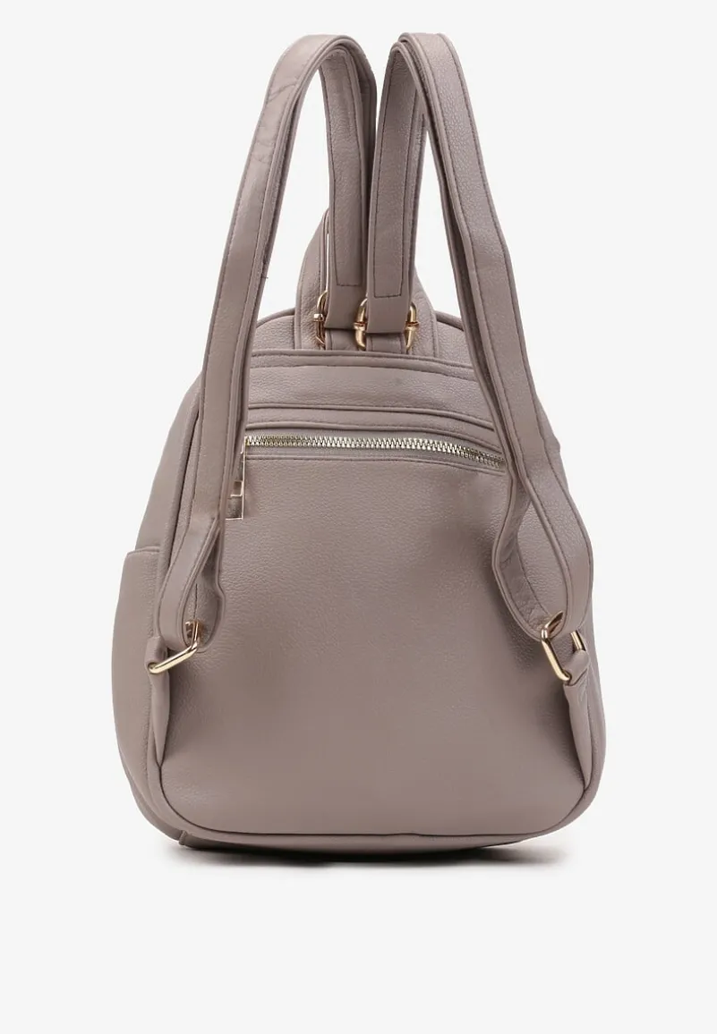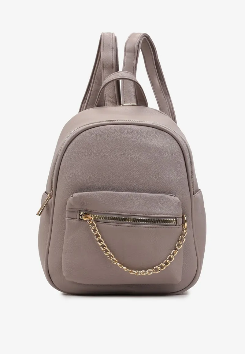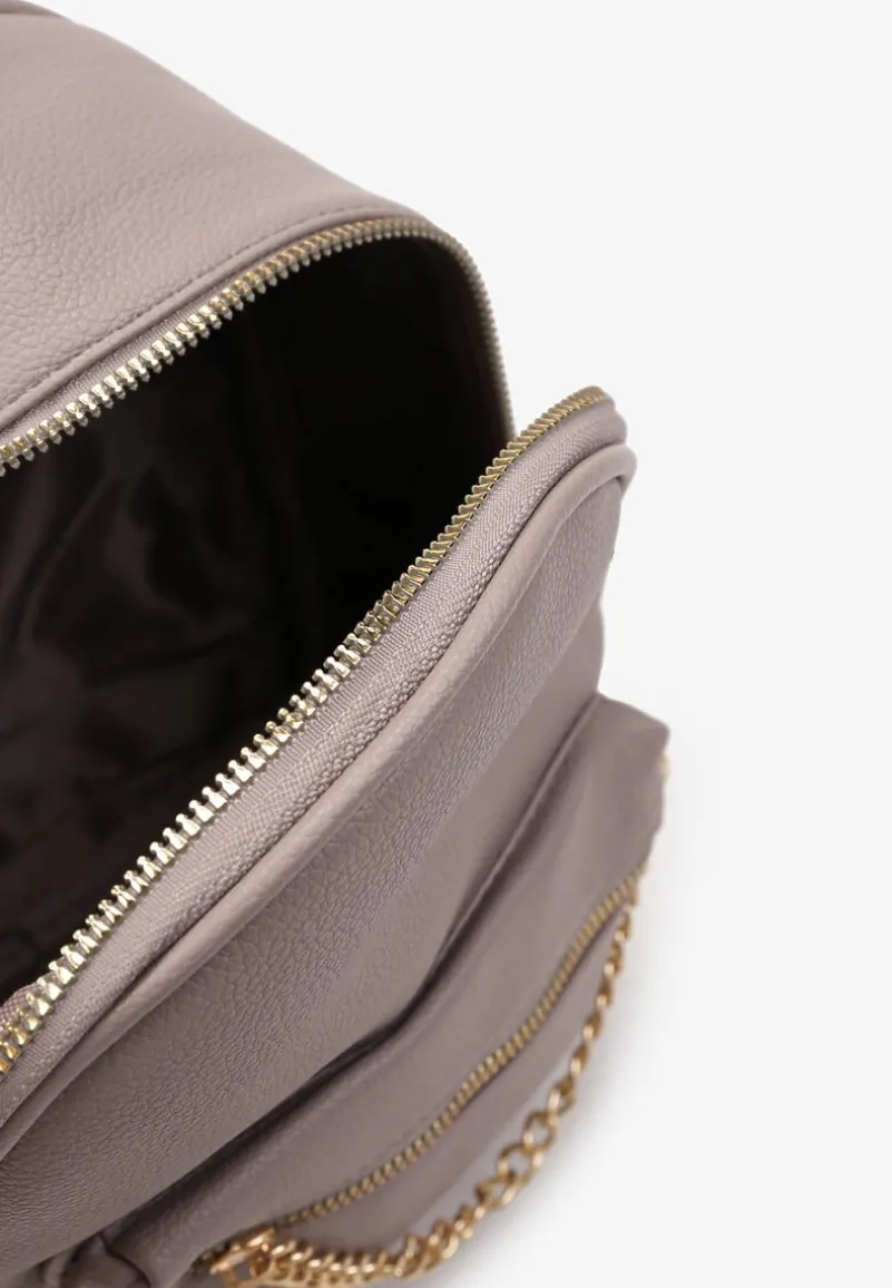Plecak Carnissa z ekoskóry, na regulowanych szelkach. Zapinany na zamek błyskawiczny. Z przodu i z tyłu posiada dodatkowe kieszonki na suwak. Ozdobiony metalicznym łańcuszkiem. Urozmaici każdą casualową stylizację.