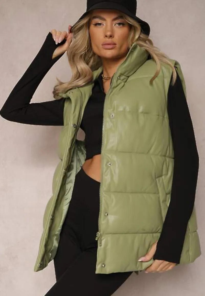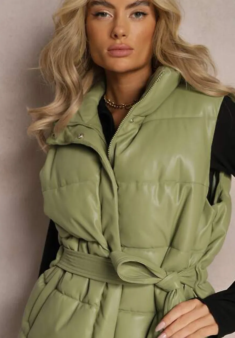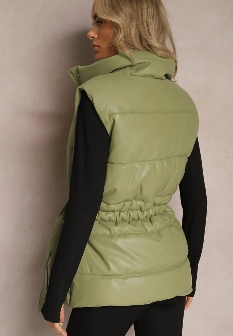 Kamizelka Sotochus to oryginalny fason z ekoskóry, wiązany w pasie. Krój lekko przedłużony, wykończony wysokim kołnierzem. Z tyłu w pasie wszyta szeroka gumka, po bokach wszyte paski. Dodatkowo zapinana na zamek błyskawiczny i napy. Wsuwane kieszenie po bokach. Będzie ciekawym dopełnieniem miejskich stylizacji.