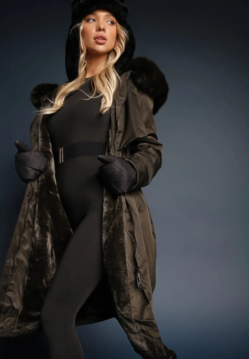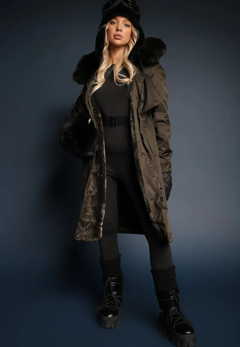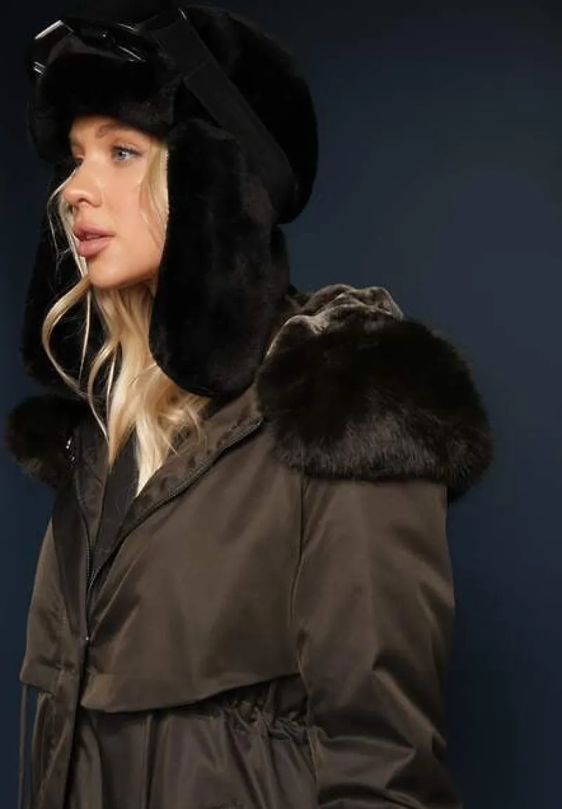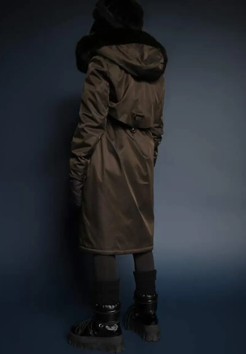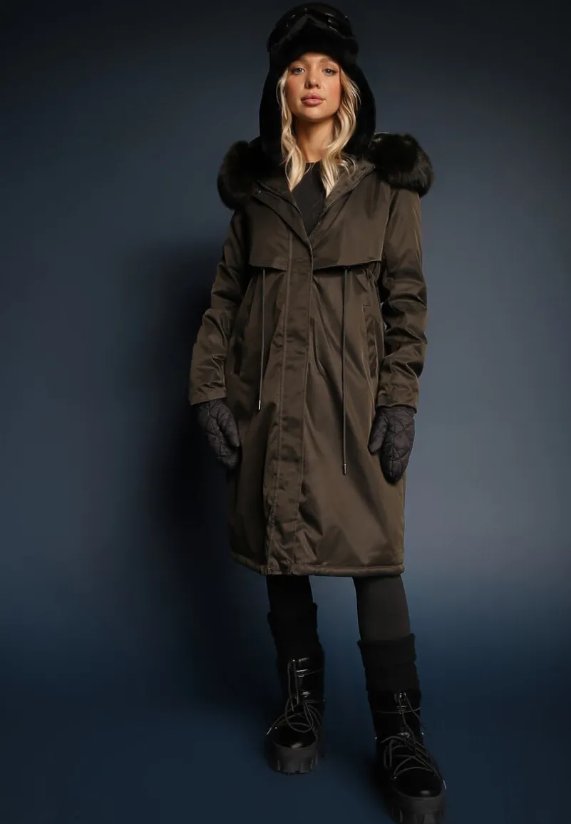 Kurtka Livieya sięgająca za kolano, ściągana w pasie troczkiem. Ocieplana od środka sztucznym futerkiem. Przód zapinany na zamek błyskawiczny ukryty pod plisą na napy. Wsuwane kieszenie na wysokości bioder. Posiada kaptur z odpinaną imitacją futerka.