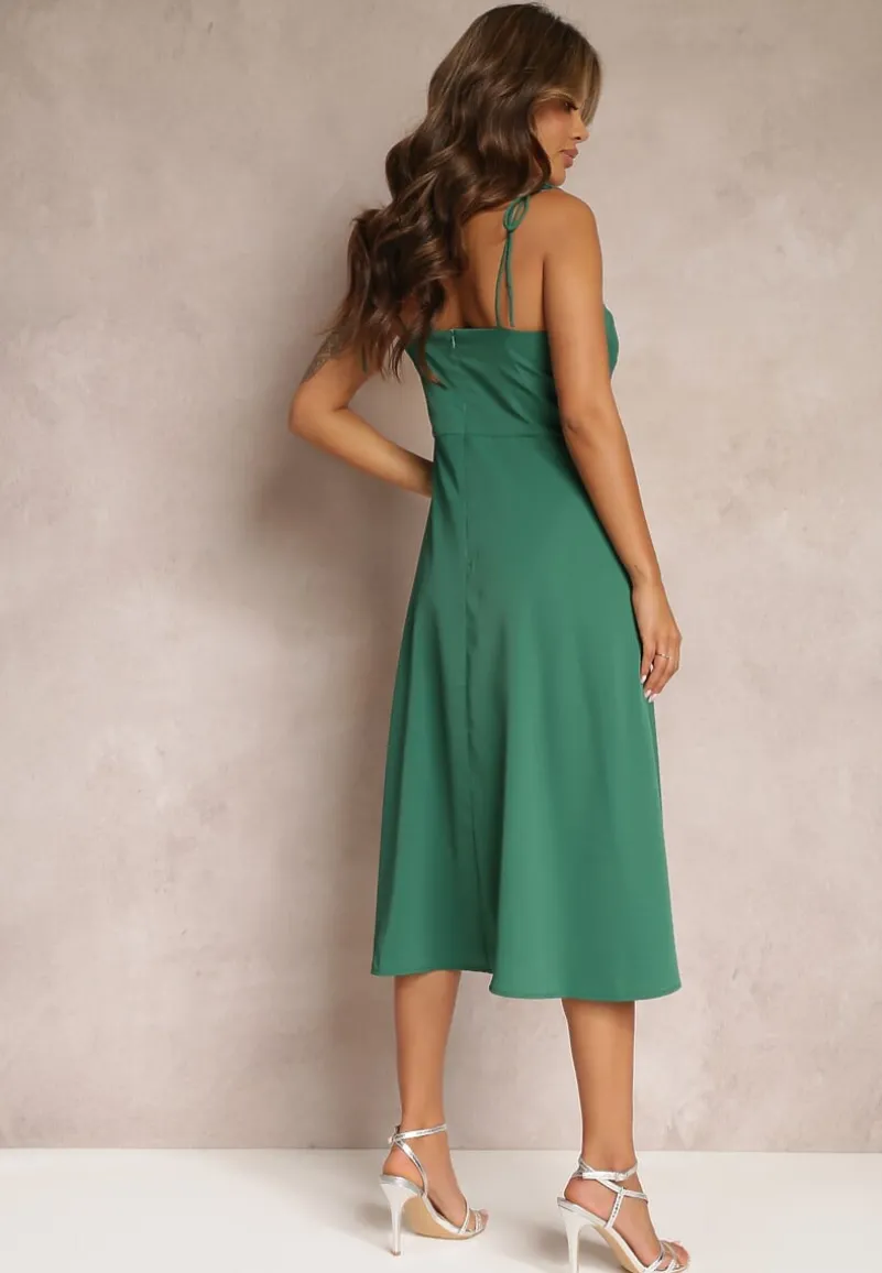 Zielona Rozkloszowana Sukienka Midi z Rozcięciem na Ramiączkach Josine