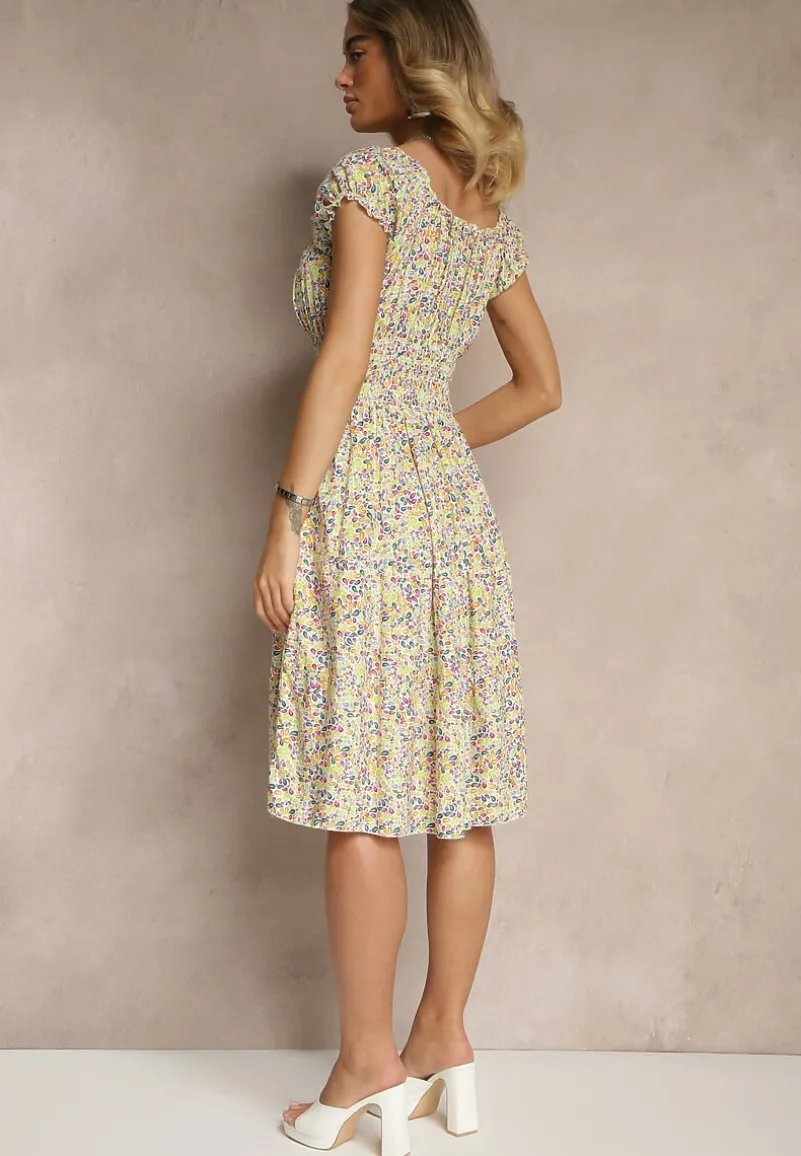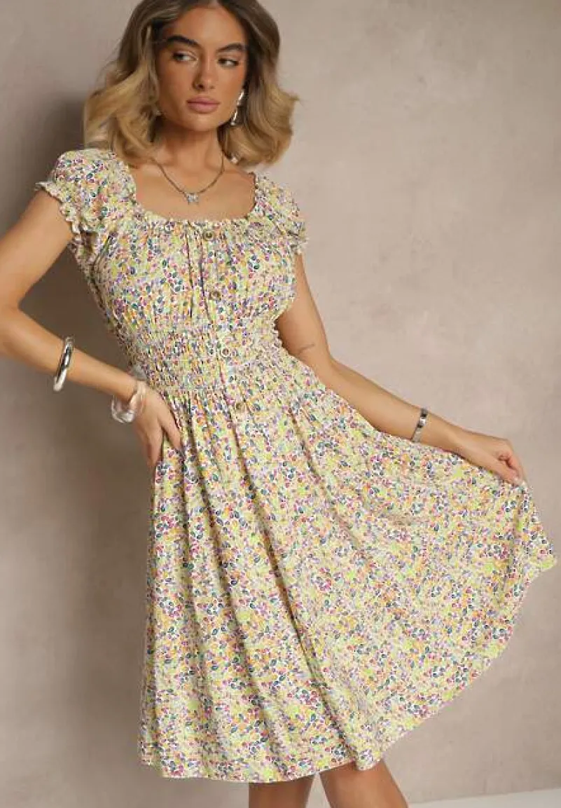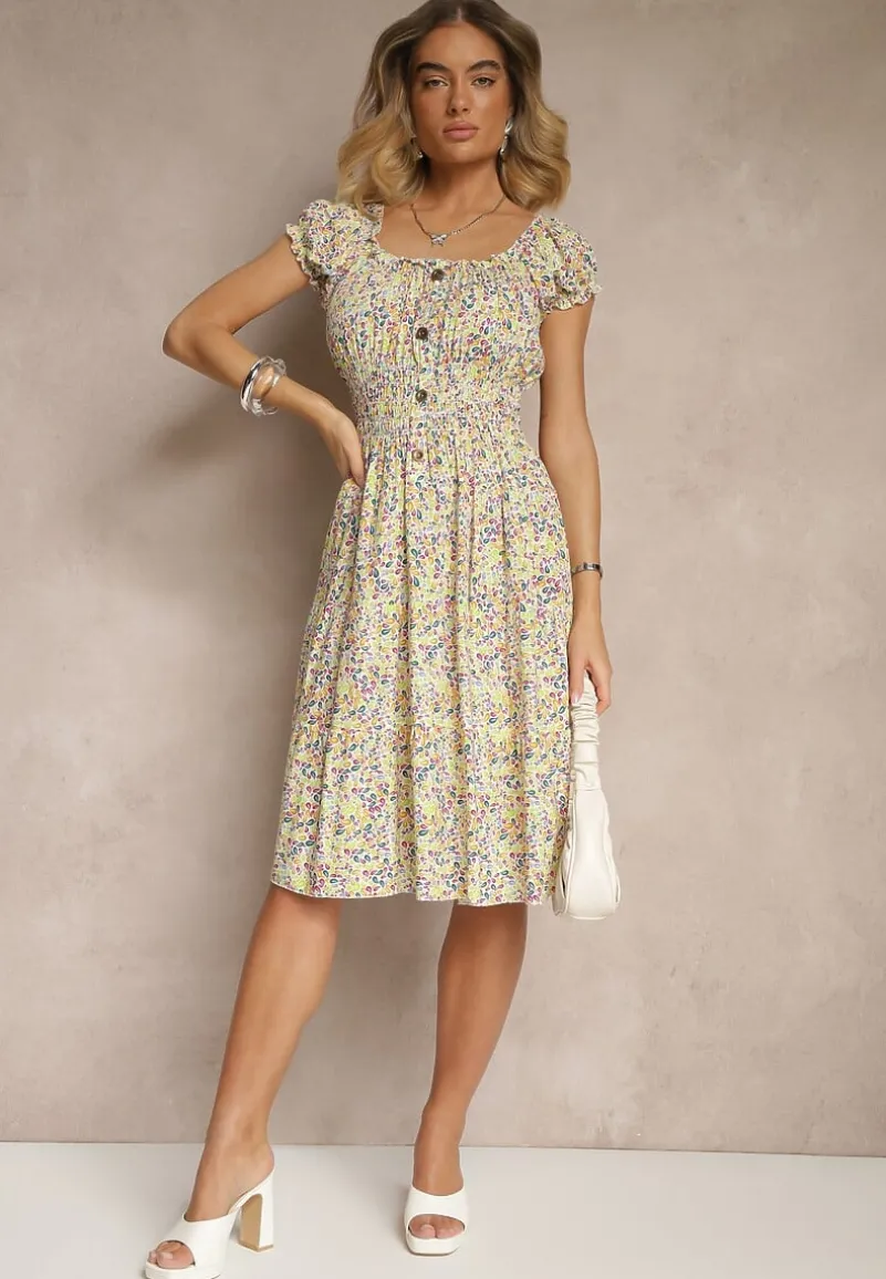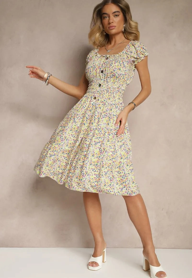 Odkryj urok sukienki z bawełny ozdobionej guzikami i bufastymi rękawami Zelliova – prawdziwy hit tego sezonu! Jej zwiewny fason oraz delikatny kształt dekoltu dodadzą Ci lekkości i romantyzmu. Krótkie, bufiaste rękawy wprowadzą do Twojej stylizacji nutkę vintage, idealnie nadając się na spotkanie z przyjaciółkami. Połącz ją z espadrylami i słomkową torbą na co dzień lub załóż szpilki oraz elegancką kopertówkę, by błyszczeć na wieczornym wyjściu! Gumka w pasie po rozciągnięciu: M/L-95 cm, XL/XXL – 99 cm.