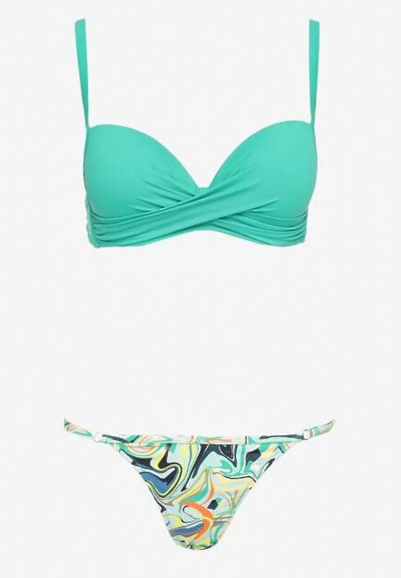Bikini Pammarie to kwintesencja letniego stylu w modnej odsłonie. Biustonosz z usztywnieniem i subtelnymi marszczeniami, z możliwością regulacji ramiączek zapewnia dopasowanie. W zestawie dwie pary majtek z efektownymi wiązaniami i regulacją. Ta dwuczęściowa propozycja to doskonały wybór na plażowe spacery czy relaks przy basenie. Połącz je z lekkim pareo i sandałami na platformie, a na wieczorny koktajl przy zachodzie słońca dodaj złote akcesoria i zwiewną narzutę, by stworzyć olśniewający, wakacyjny look.