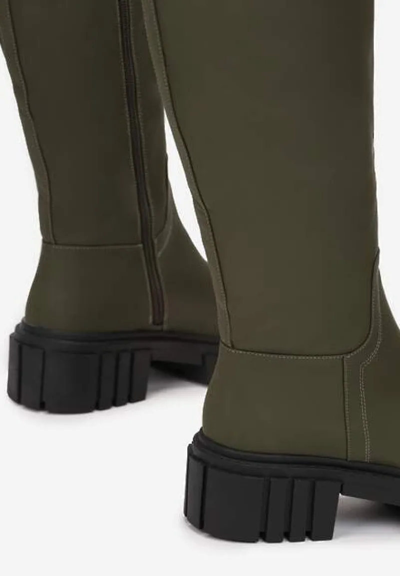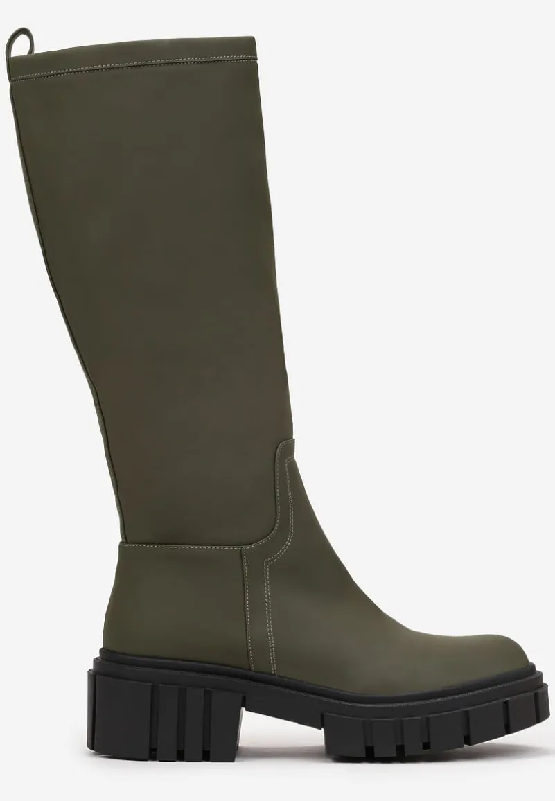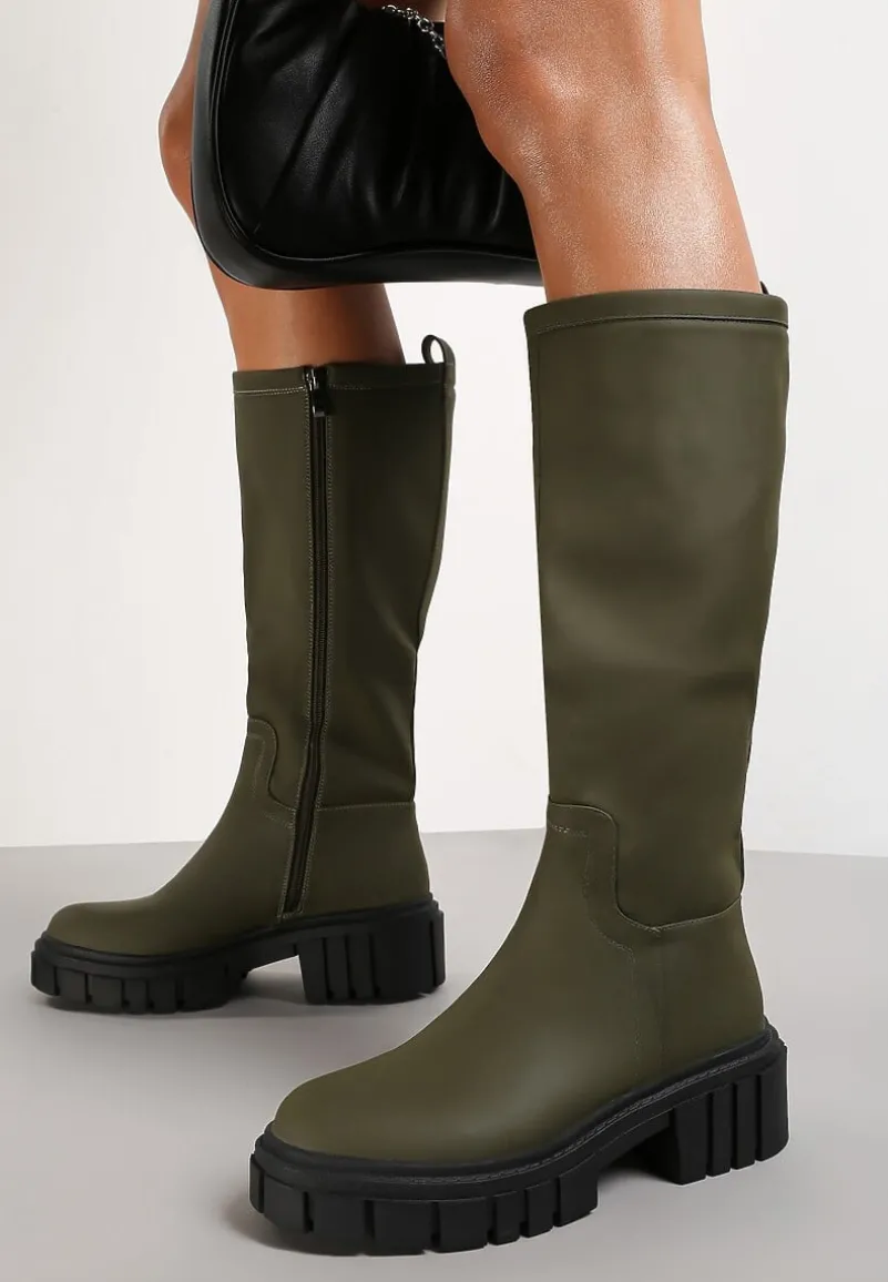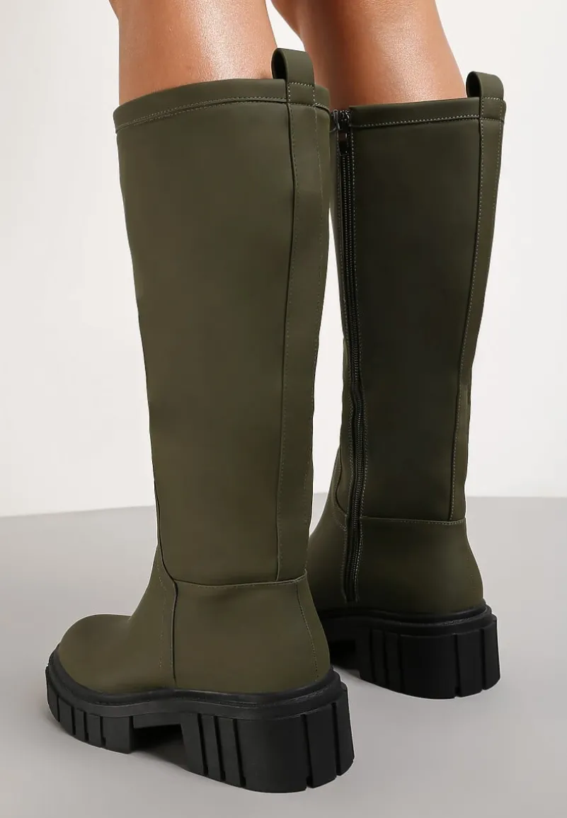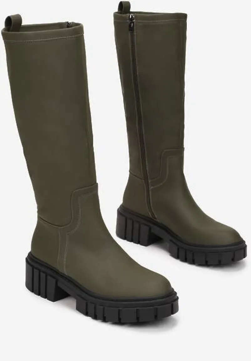 Kozaki Pyrhea zapinane na zamek błyskawiczny. Cholewka kończąca się przed kolanem. Nosek klasyczny, o zaokrąglonej krawędzi. Osadzone na grubej podeszwie z obcasem, żłobieniami i protektorem. Wykonane z ekoskóry, lekko ocieplane. Dobrze leżą na wąskiej stopie. Idealne do spodni z dopasowaną nogawką oraz spódnic i sukienek mini.