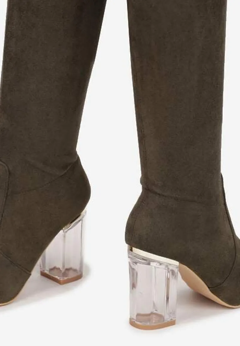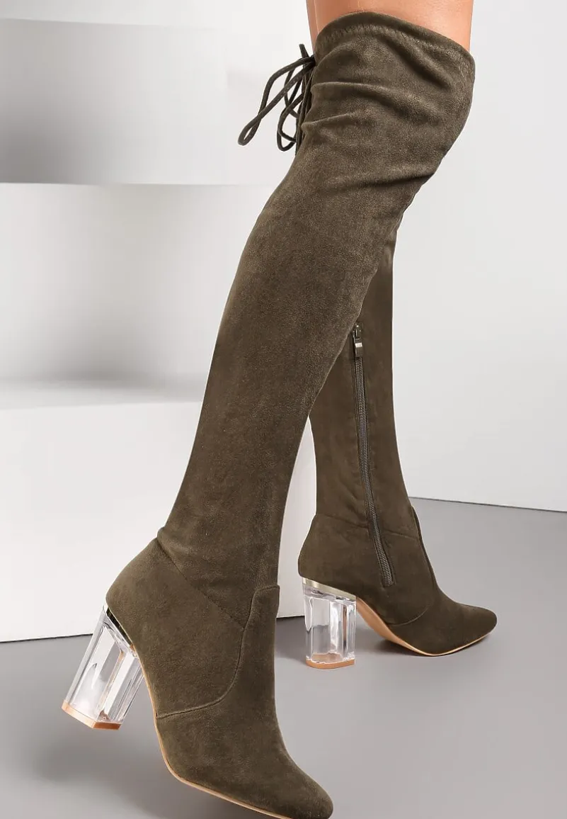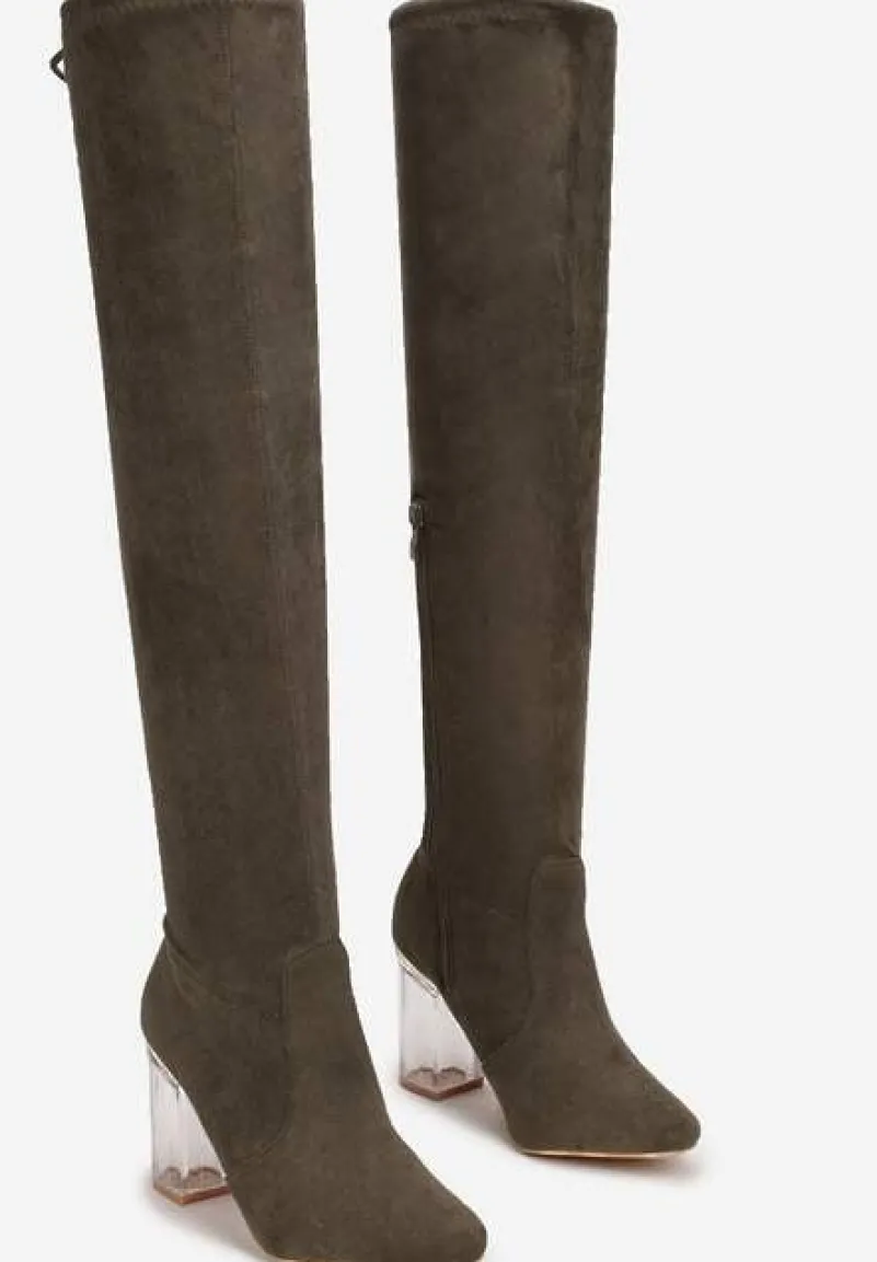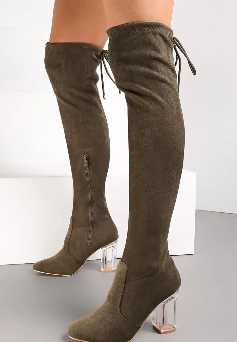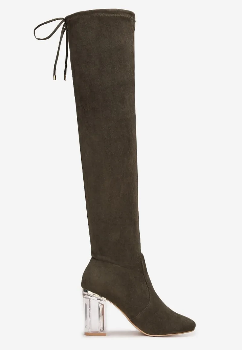 Kozaki Tonasket z okrągłym noskiem oraz wysoką cholewką zakończoną wiązaniem, którym dostosujesz szerokość. Na wysokim, przezroczystym słupku. U dołu delikatne przeszycia. Zapinane na zamek błyskawiczny. Wykonane z ekozamszu. Polecamy wybór większego rozmiaru. Pięknie podkreślą nogi i dodadzą Ci modnego akcentu!