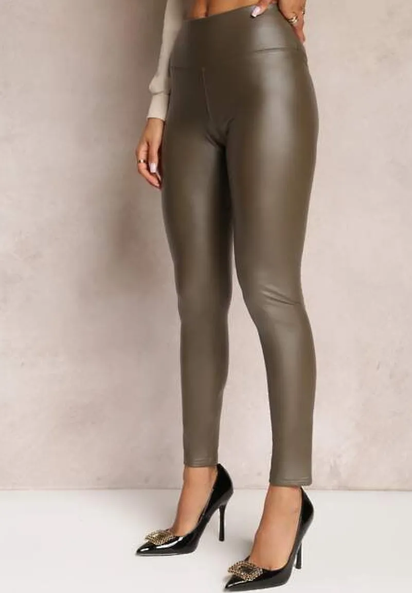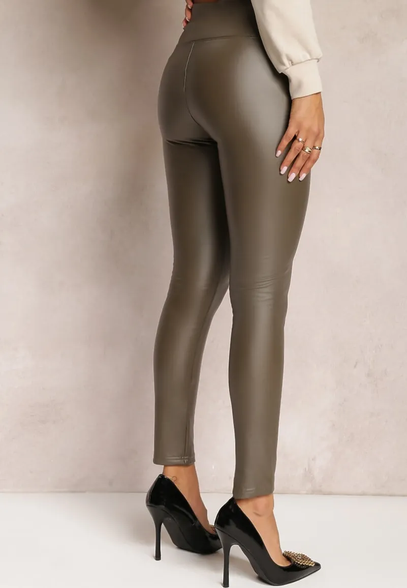 Legginsy Lenho o dopasowanym fasonie, z wysokim stanem. W pasie wszyta gumka. Model wykonany z imitacji skóry, wykończony od środka polarem.
