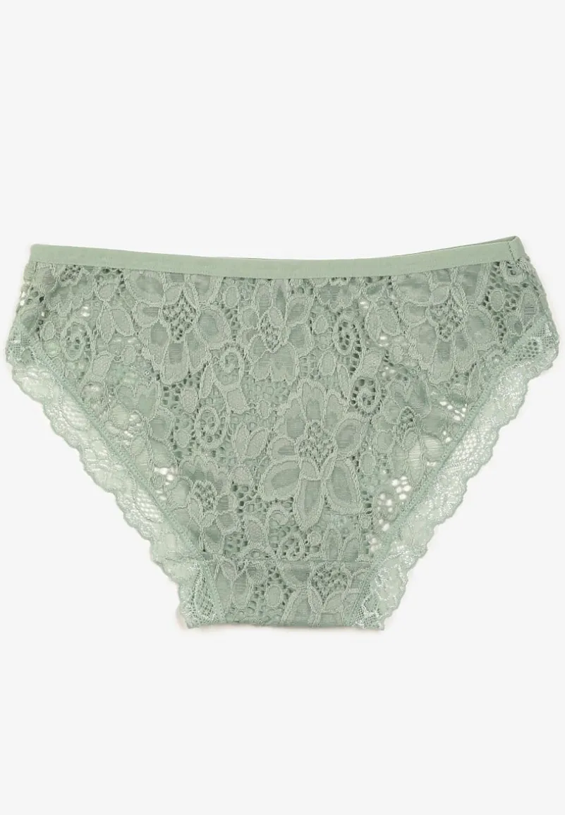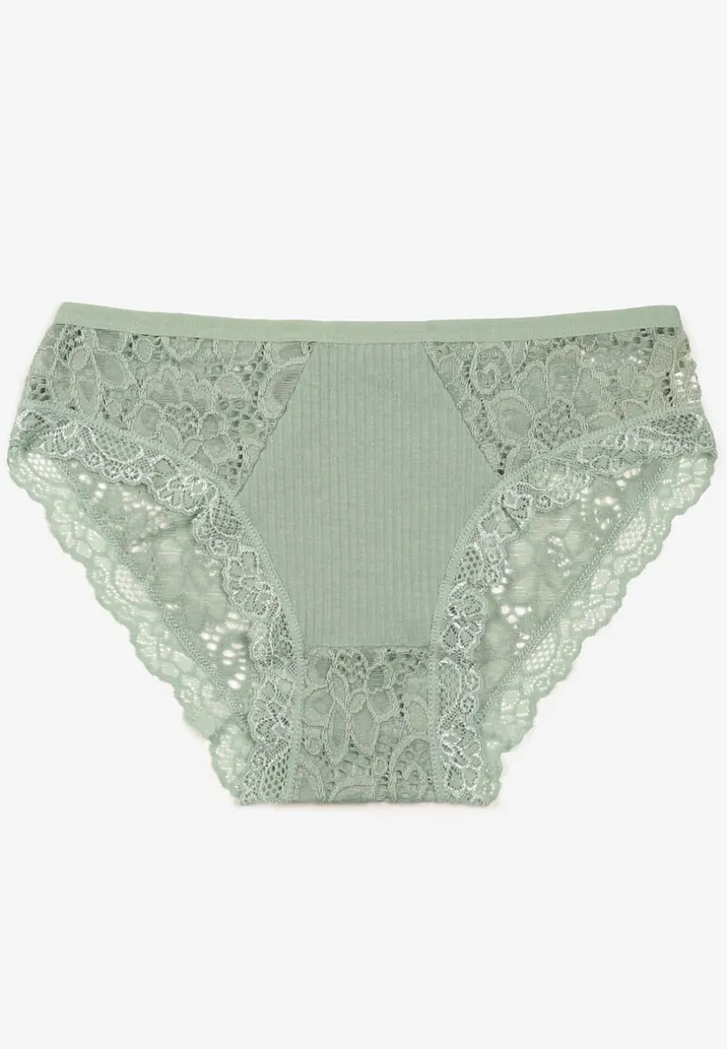 Majtki figi Okarde z ozdobną koronką i wstawką z prążkowanego materiału. Wykonane z elastycznej bawełny, która zapewni komfort przez cały dzień.