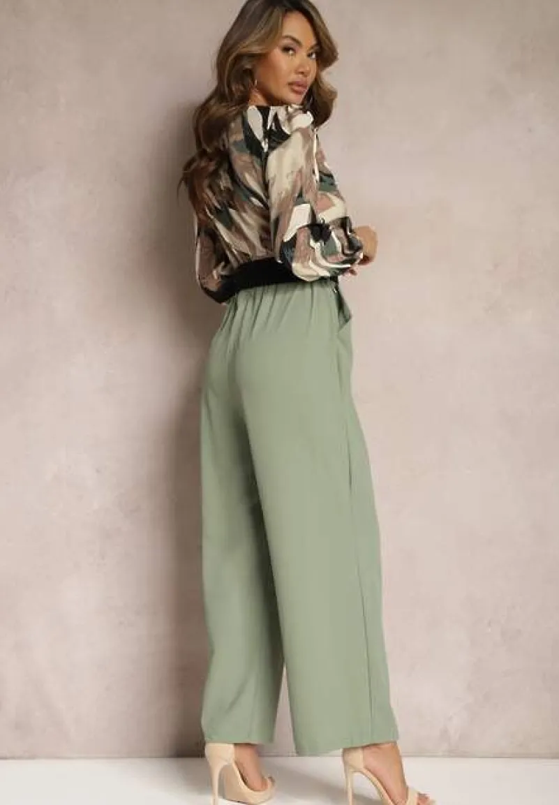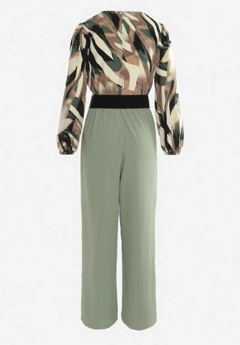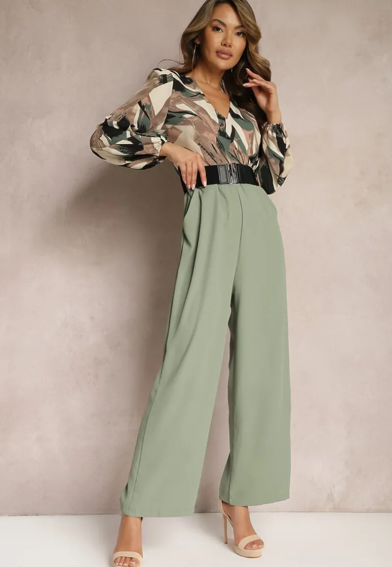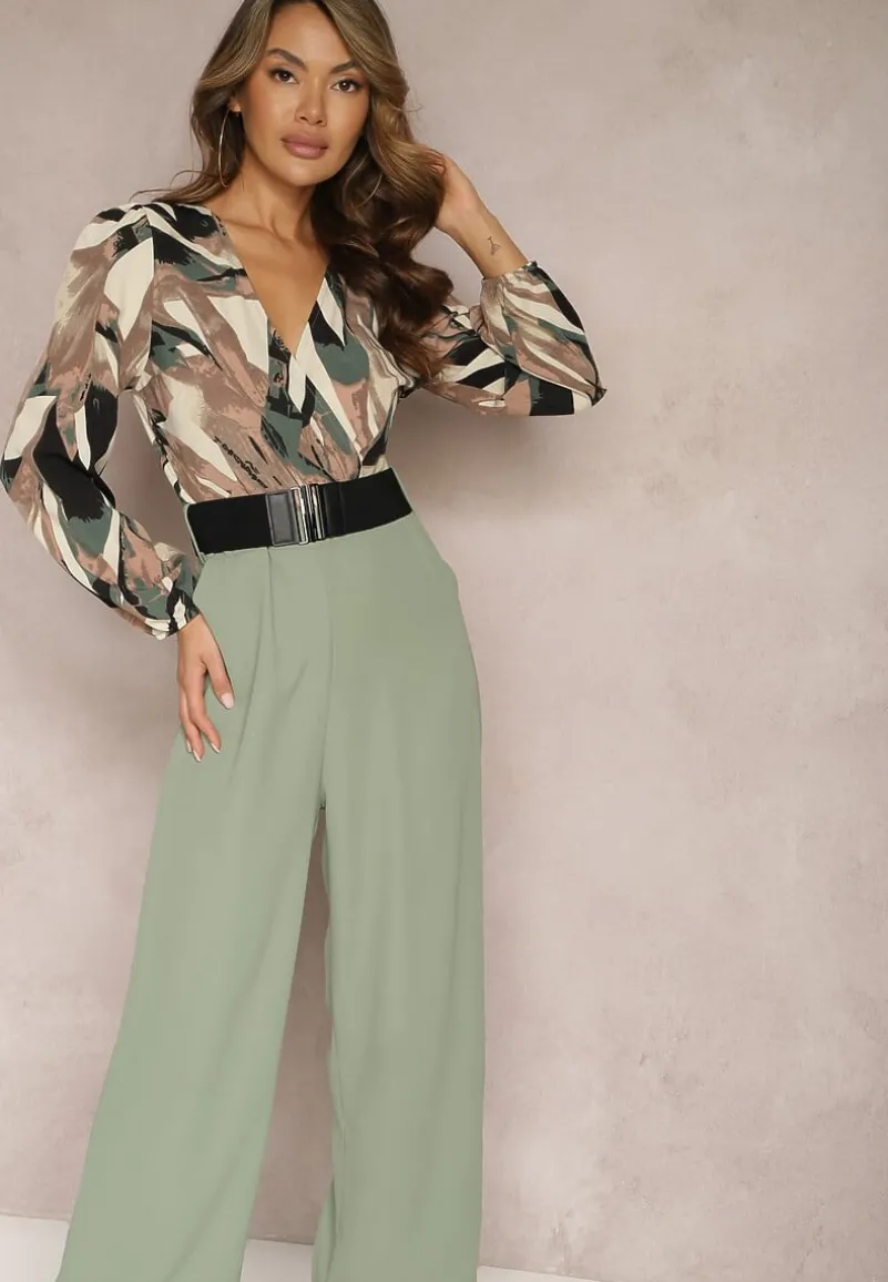 Zielono-Beżowy Kopertowy Kombinezon z Paskiem i Szerokimi Spodniami Nittama
