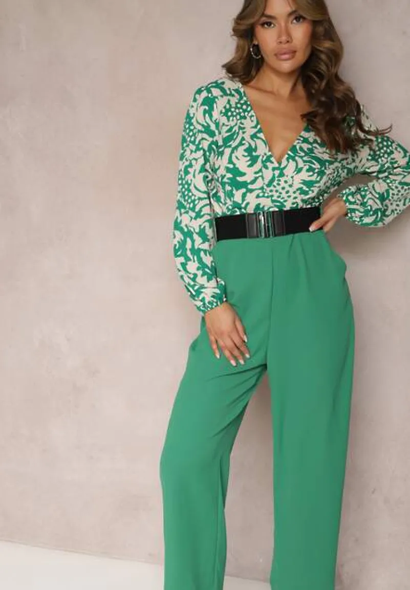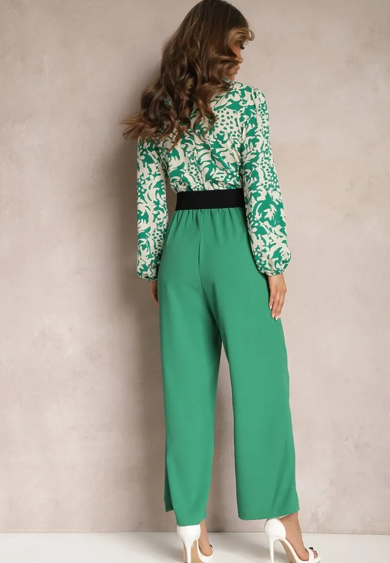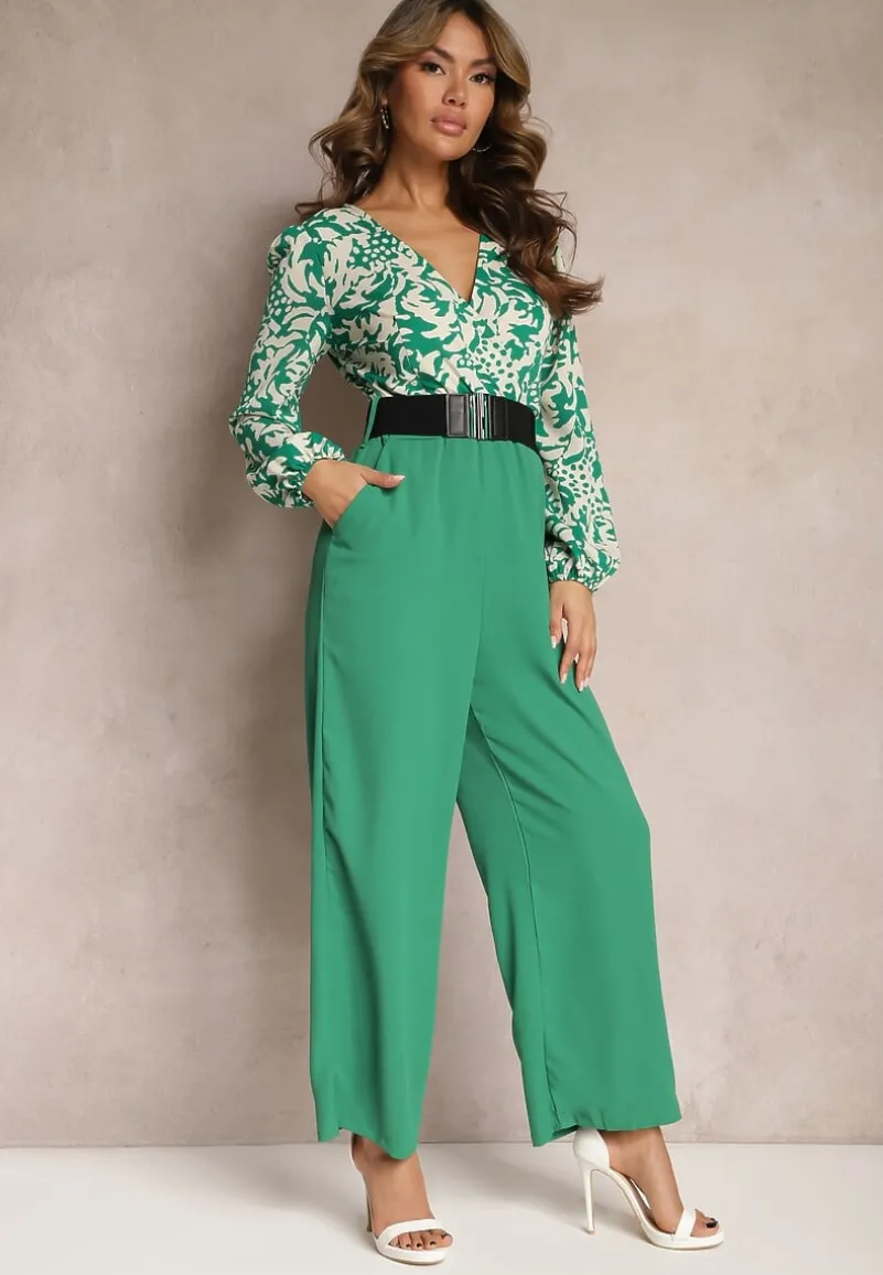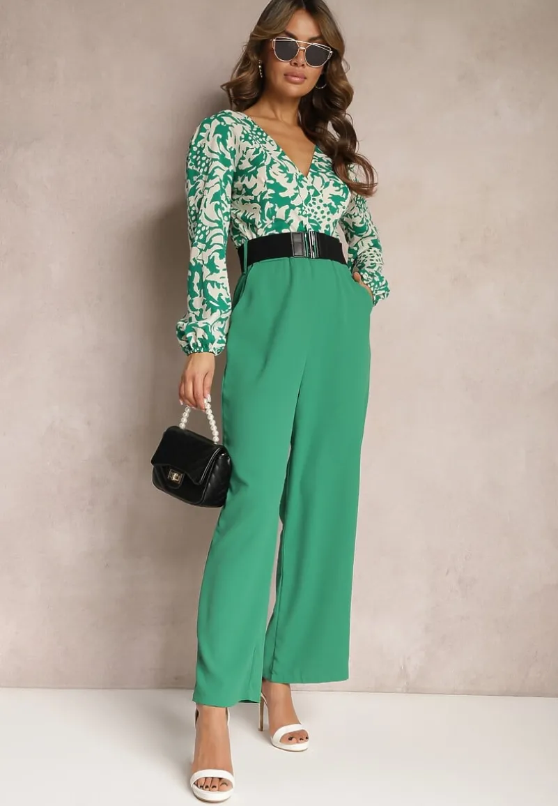 Zielono-Biały Kombinezon w Print z Paskiem i Szerokimi Nogawkami Stuvana