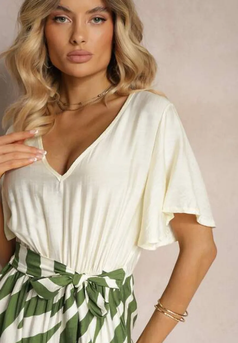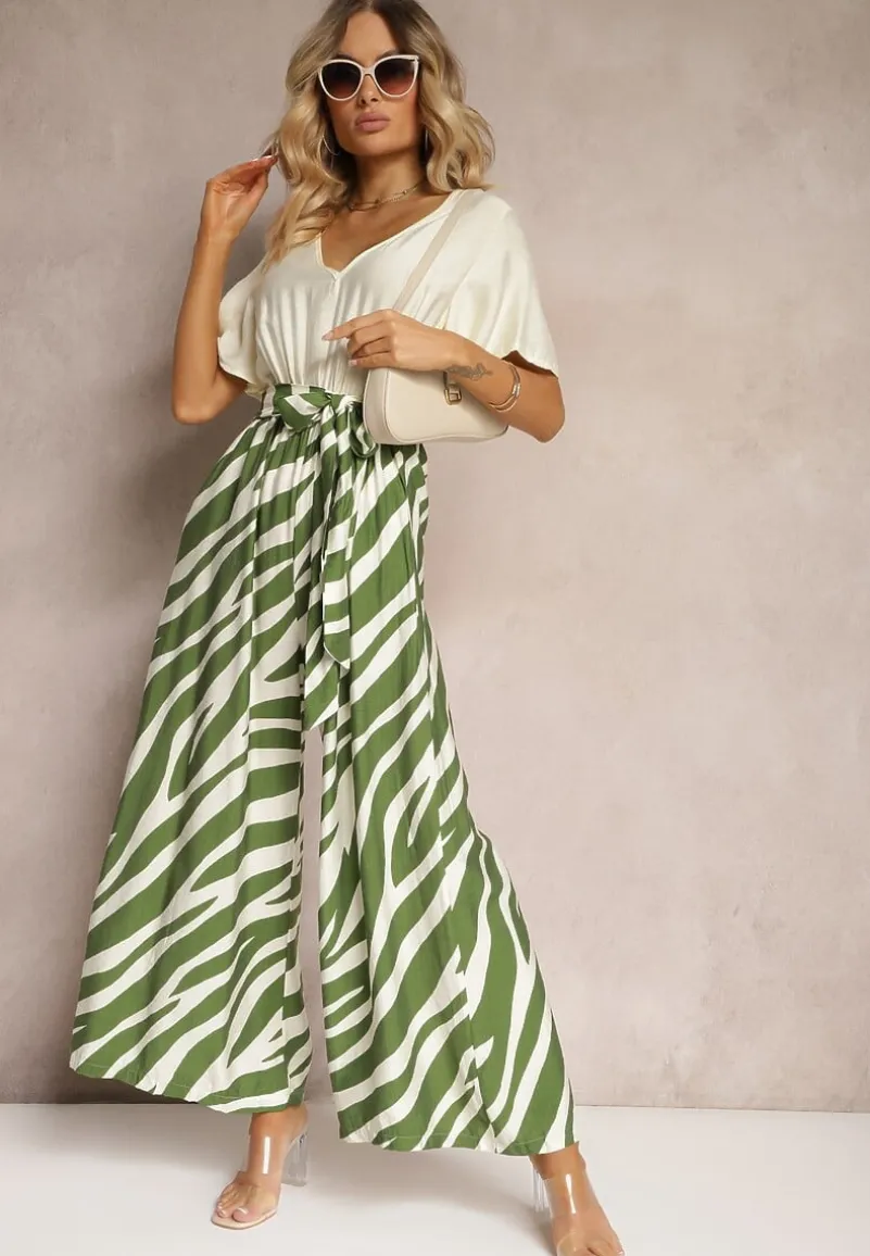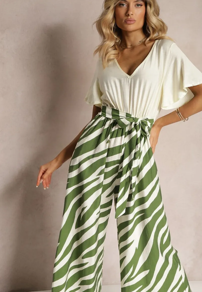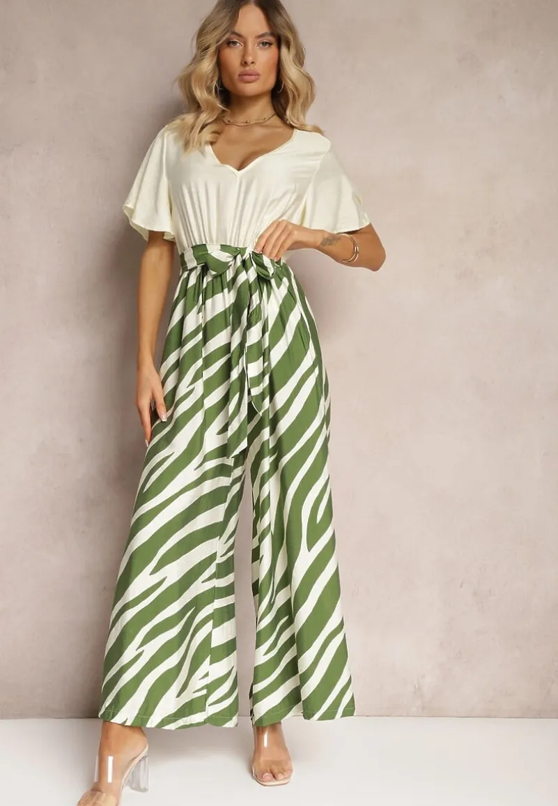 Zielono-Biały Kombinezon z Materiałowym Paskiem i Szerokimi Rękawami Nellda