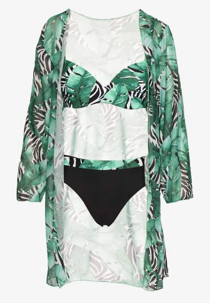 Bikini Majtki Figi Biustonosz z regulowanymi ramiączkami, zapinany z tyłu na metalowe zapięcie i Siateczkowa Narzutka Folanisse to idealny zestaw na letnie przygody! Zaskoczy Cię modny wzór w liście, który doda świeżości i energii Twoim stylizacjom. Siateczkowa narzutka doskonale uzupełnia całość, tworząc look perfekcyjny na plażę lub przy basenie. Stylizuj go z oversize’owymi szortami i klapkami na co dzień.