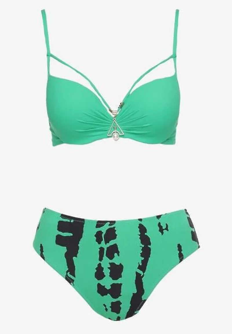 Zielono-Czarne Bikini Strój Dwuczęściowy Biustonosz z Regulowanymi Ramiączkami Majtki High Waist Laloen