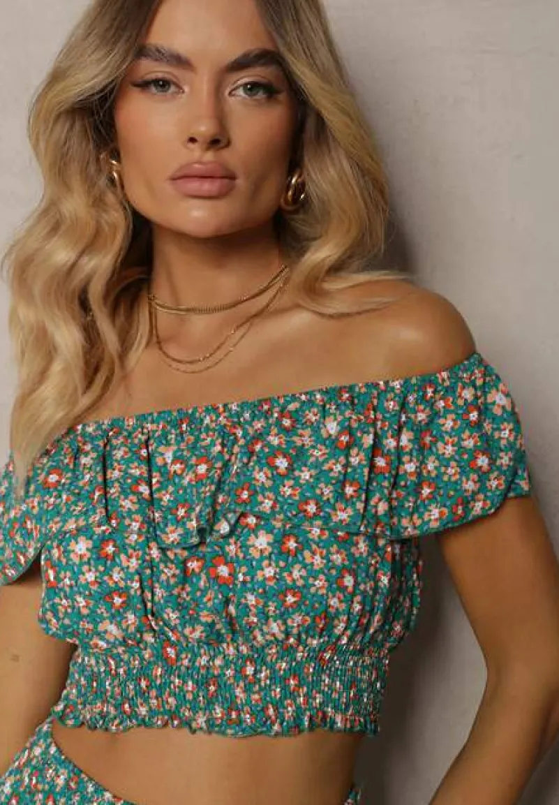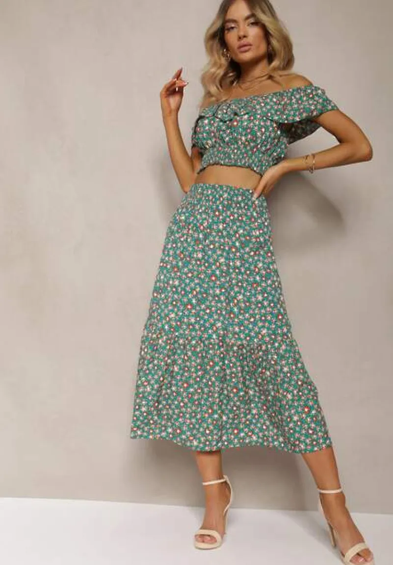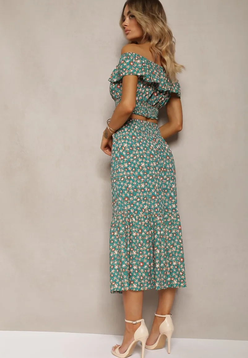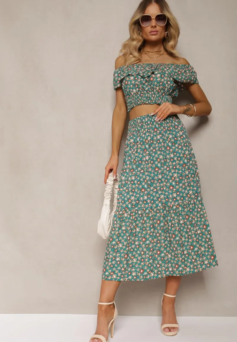 Modny komplet w kwiaty z letniej kolekcji, składający się z topu hiszpanki i spódnicy midi z gumką w pasie.