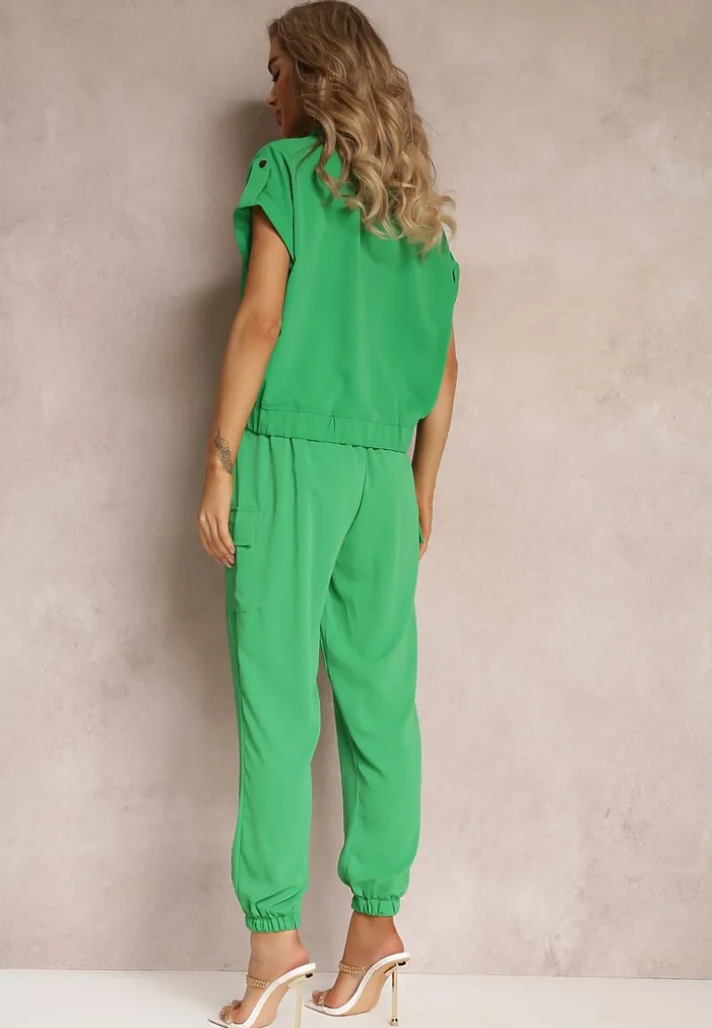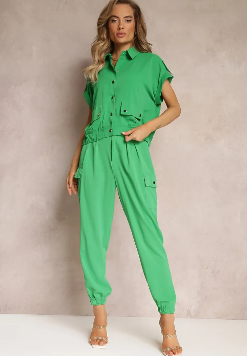 Dwuczęściowy Komplet Ezrala składający się z bluzki oraz spodni. Bluzka zapinana z przodu na napy, dół zakończony lekko marszczoną gumką. Dodatkowo zdobiona kieszeniami z klapą. Spodnie do zestawu z gumką w pasie i na dole nogawek. Zapinane na guzik i suwak. Po bokach naszyte kieszenie z klapami.