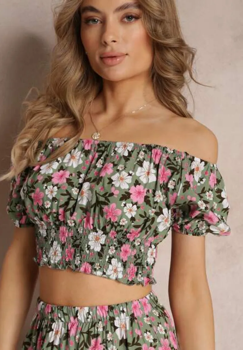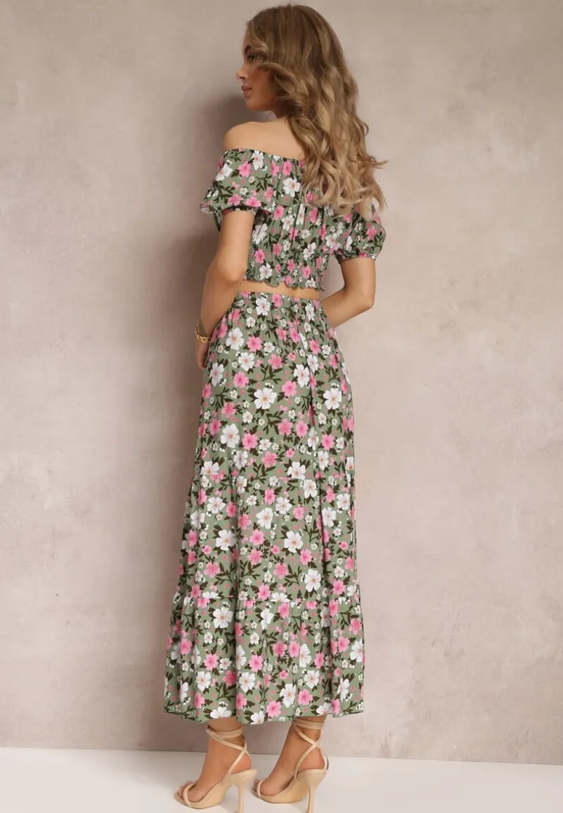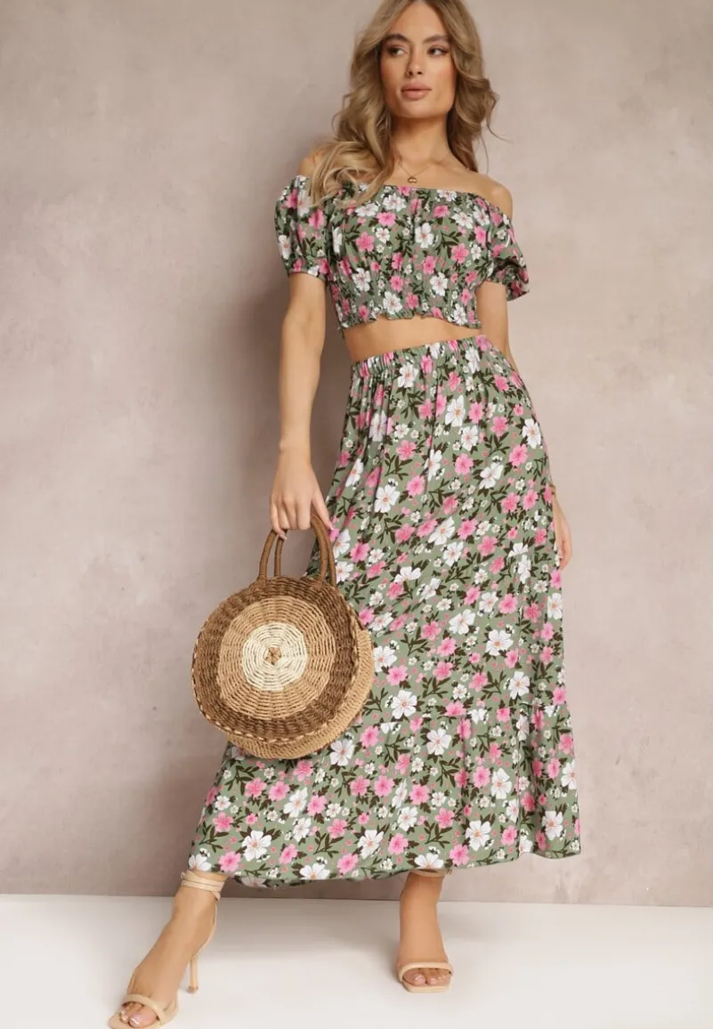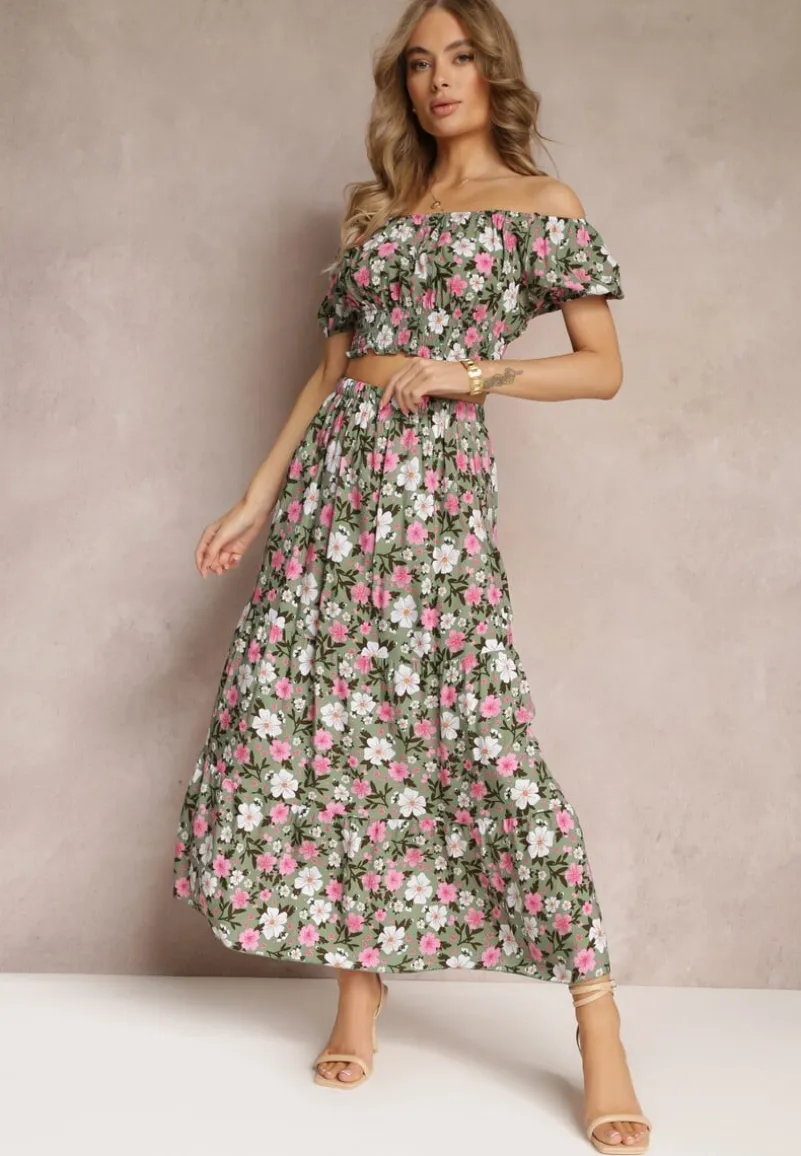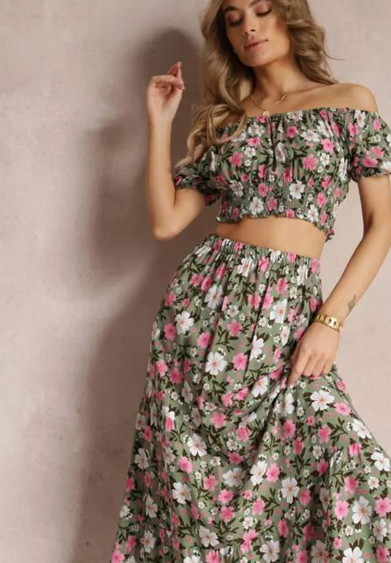 Dwuczęściowy Komplet Malenis składający się z topu oraz spódnicy. Wykonany z bawełnianej tkaniny w kwiaty. Top typu hiszpanka, na dole cienkie, elastyczne gumki. Spódnica zdobiona lekką falbaną, w pasie elastyczna gumka. Nie posiada podszewki.