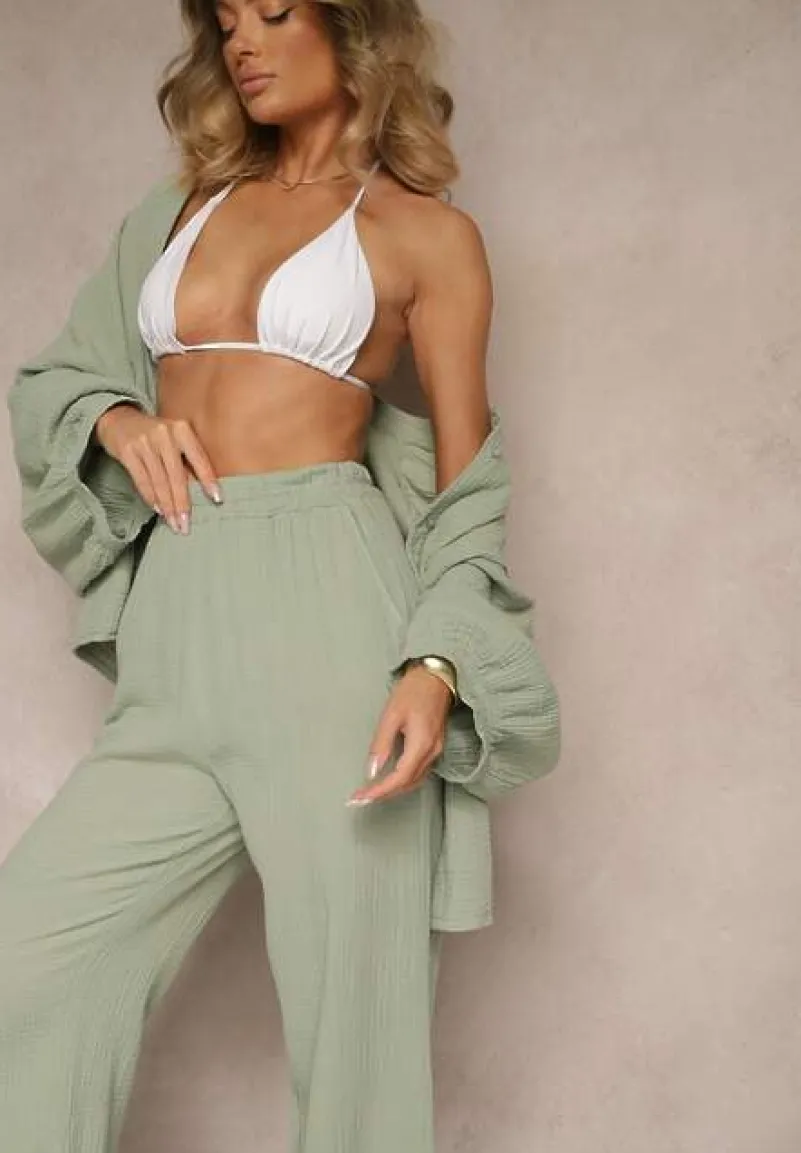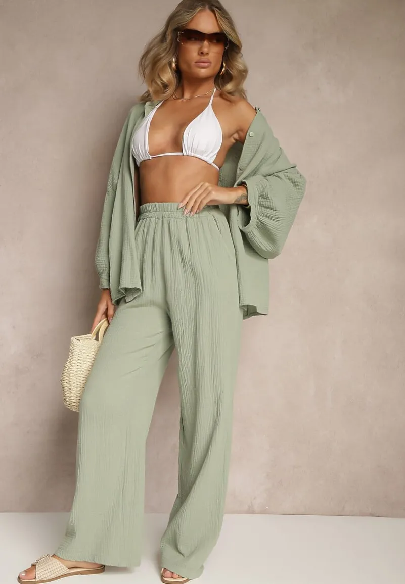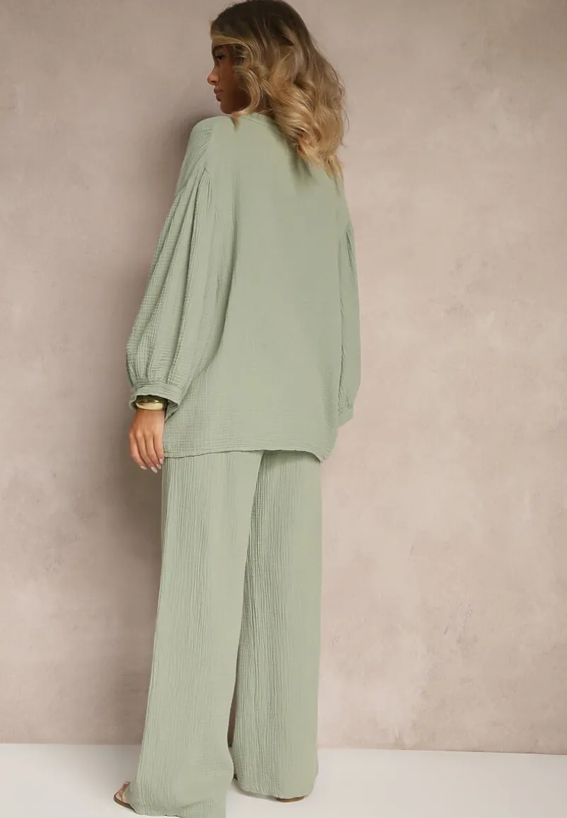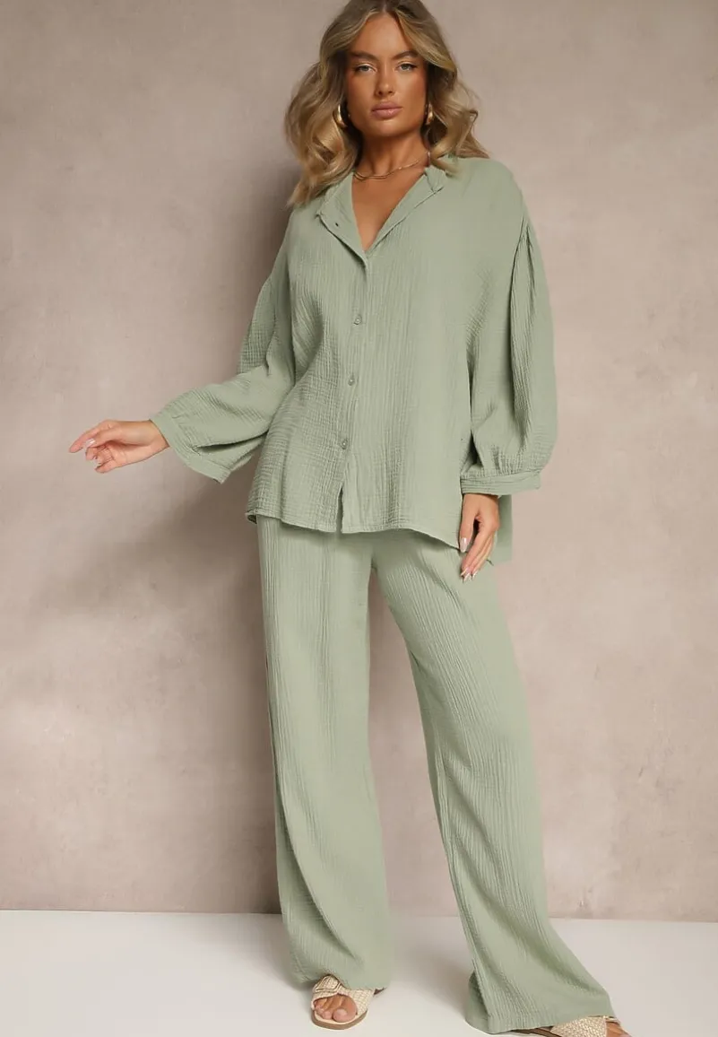 Bawełniany Komplet Muślinowy Oversize z Koszulą i Szerokimi Spodniami Ziorina to must-have nadchodzącego sezonu dla każdej fashionistki! Jego luźny krój zapewnia wygodę noszenia, a materiał z bawełny gwarantuje komfort. Idealny zarówno na codzienne wyjścia w zestawieniu z ulubionymi sneakersami i jeansową kurtką, jak i na eleganckie spotkania w połączeniu z klasycznymi szpilkami i marynarką. Zdobienia w postaci efektownych guzików oraz swobodny fason przyciągną wzrok i zapewnią pewność siebie w każdej sytuacji! Spodnie posiadają wsuwane kieszenie oraz gumkę w talii.