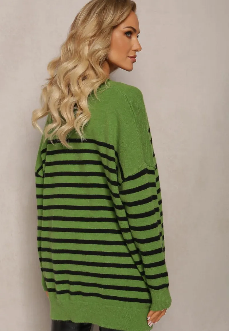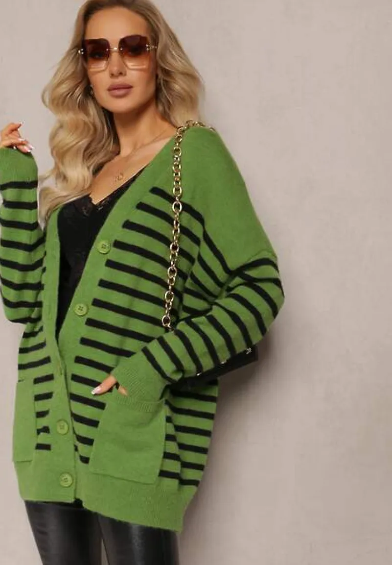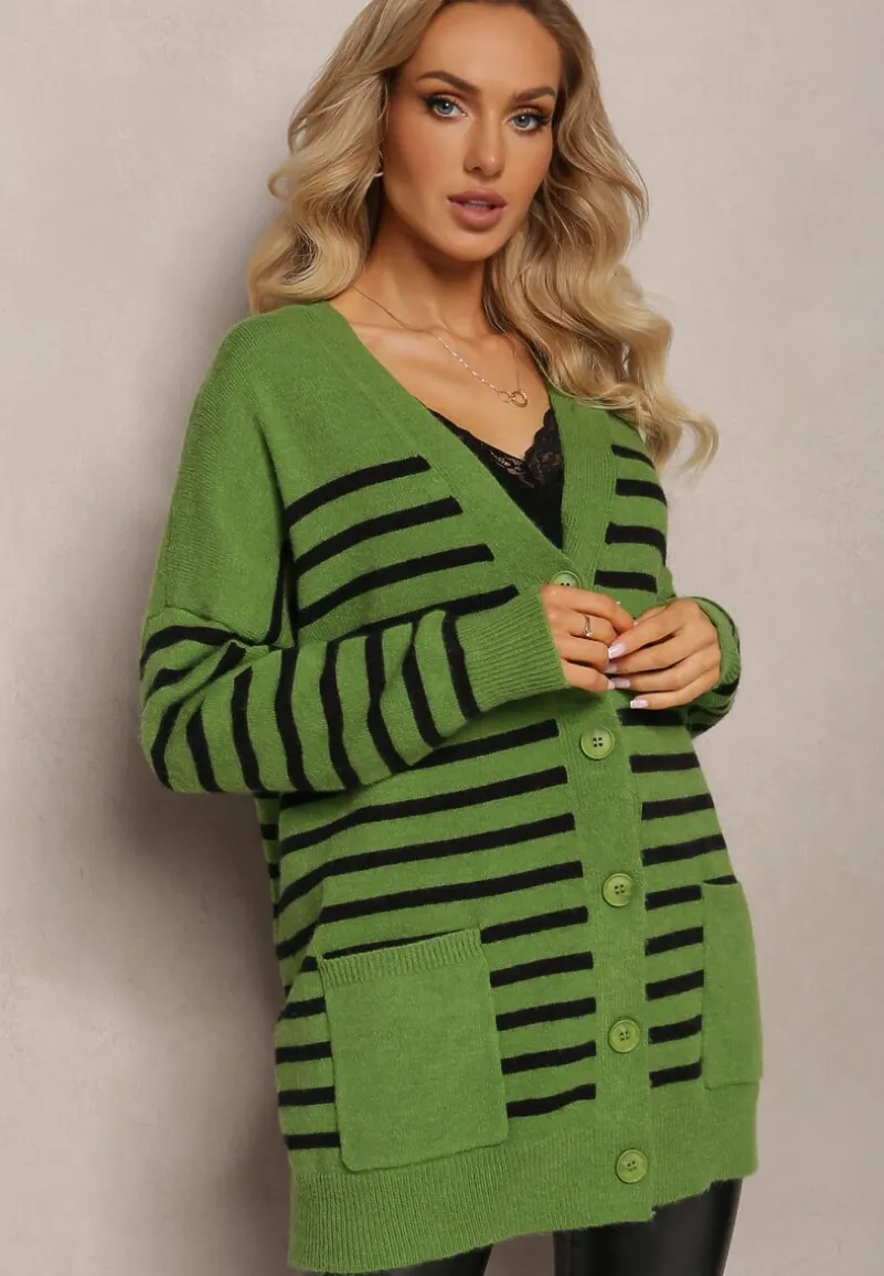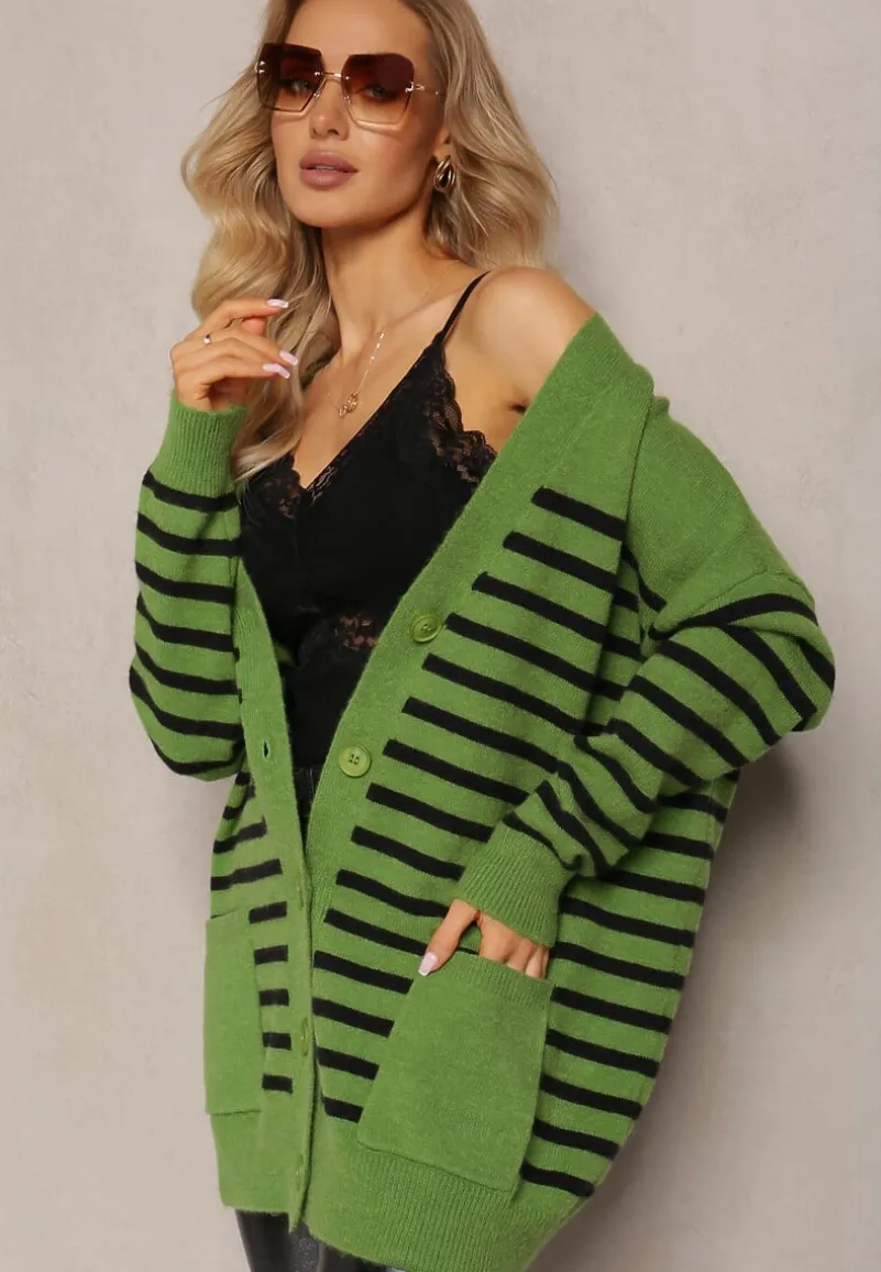Kardigan Ravime w paski to kwintesencja nonszalancji połączonej z wygodą. Jego długie rękawy oraz luźny, wydłużony fason sprawiają, że będzie doskonałym wyborem na chłodniejsze dni. Głęboki dekolt w kształcie litery V idealnie wyeksponuje szyję i pozwoli na zabawę warstwami. Wyróżniający się oryginalnym wzorem, kardigan stanie się niebanalnym elementem stylizacji – zarówno w codziennym wykorzystaniu, jak i na wieczorne wyjścia.