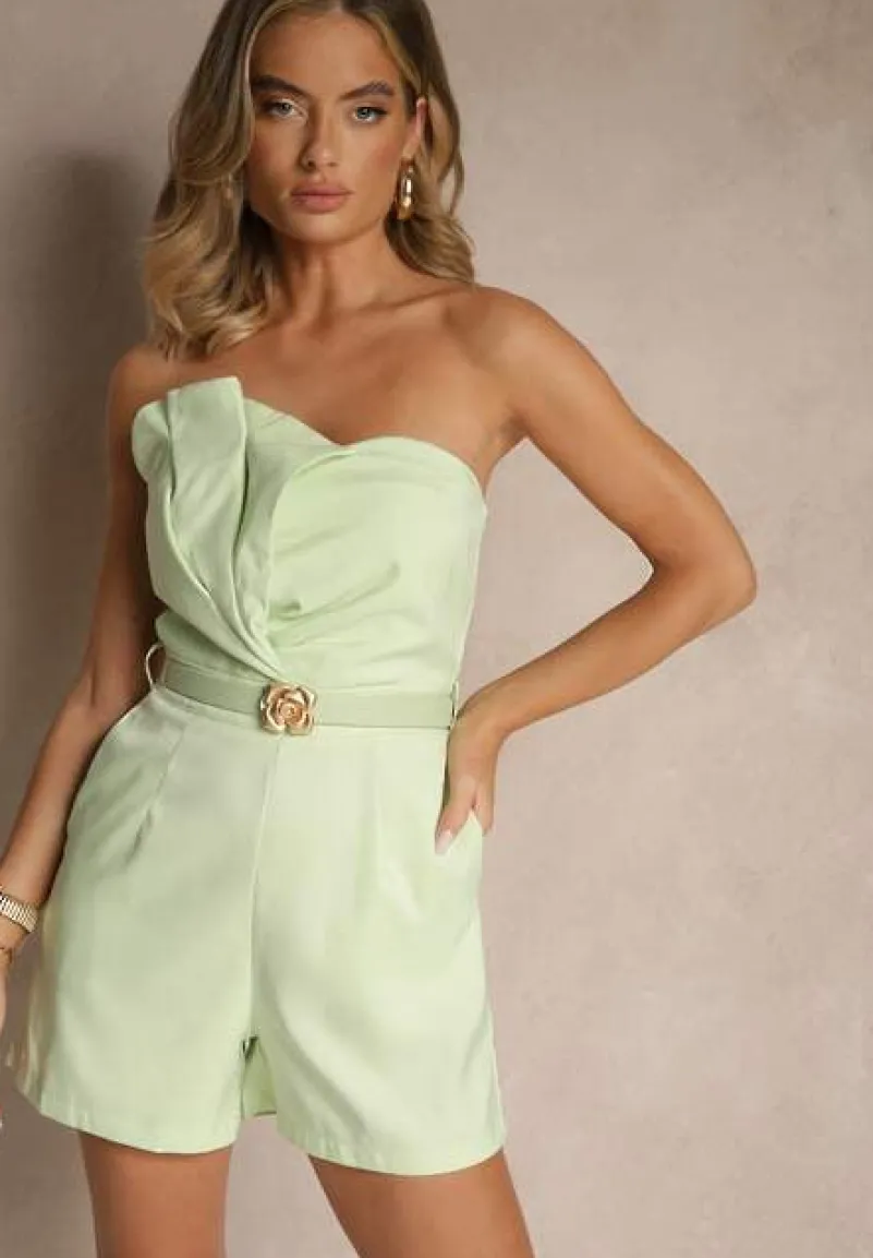 Zielony Kombinezon Bandeau z Paskiem z Klamrą Zdobiony Zakładkami Silianea