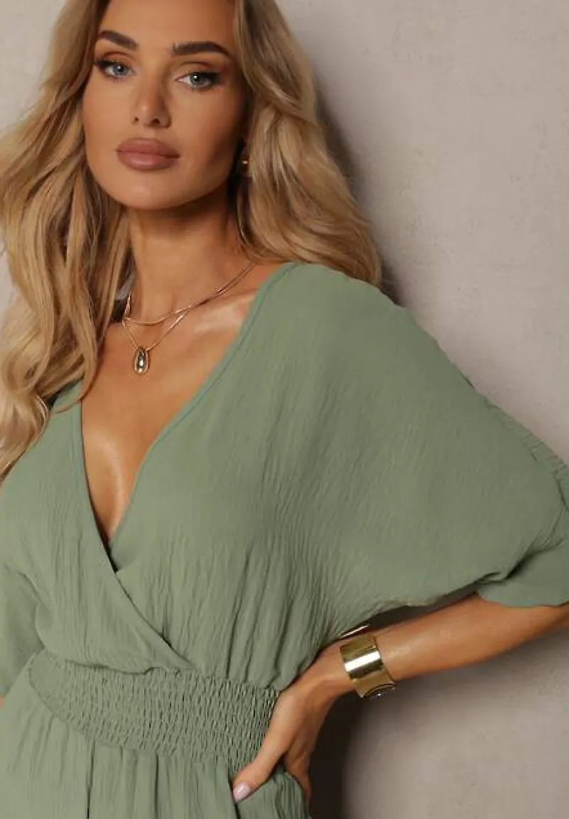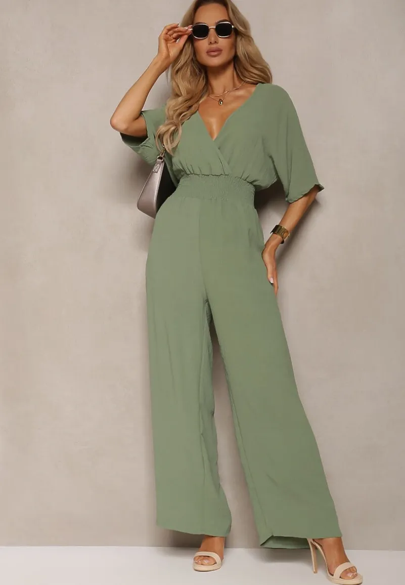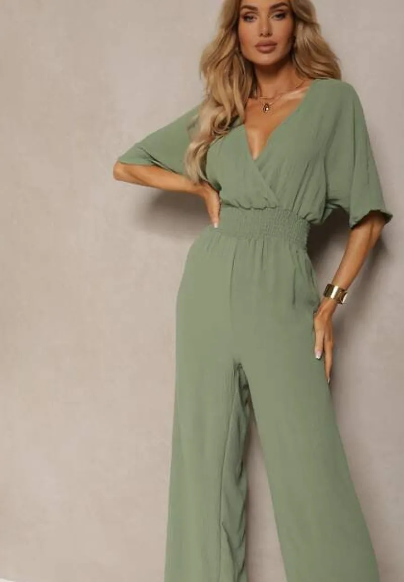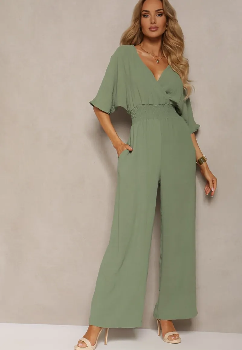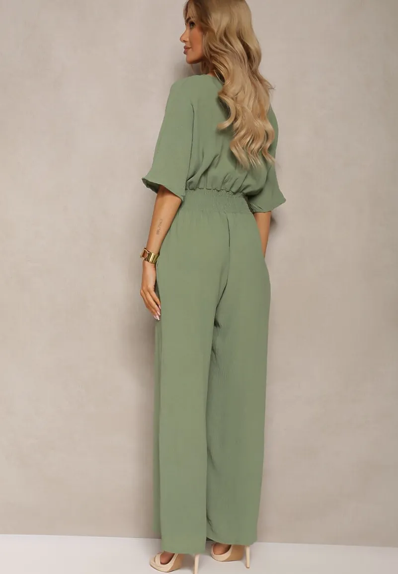Zielony Kombinezon o Kopertowym Fasonie z Szerokim Luźnym Dołem i Kieszeniami Octoni