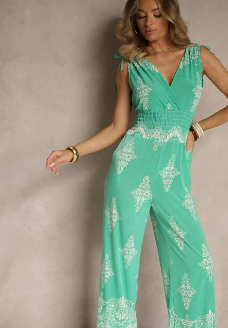 Zielony Kombinezon z Dekoltem w Kształcie Litery V Zdobiony Etnicznym Printem Izlina