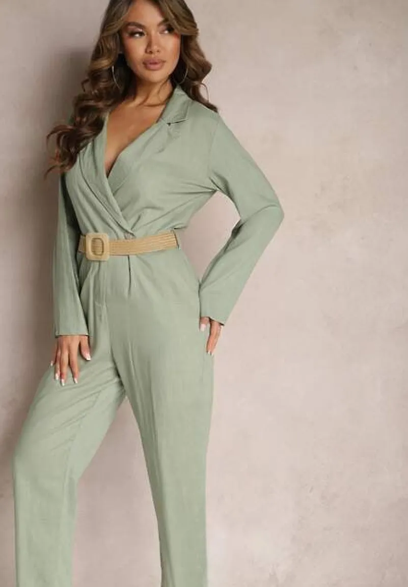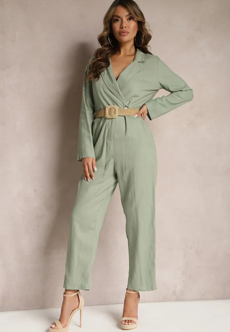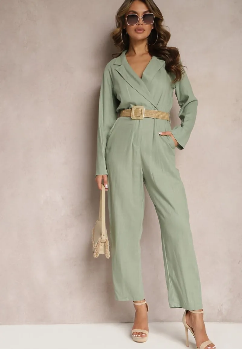 Zielony Kombinezon z Paskiem z Plecionki Kopertową Górą i Zwężającymi się Nogawkami Avnja