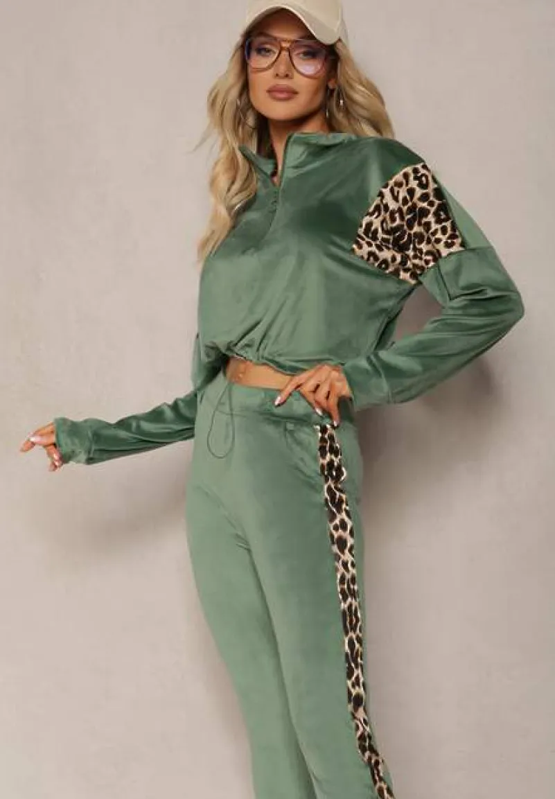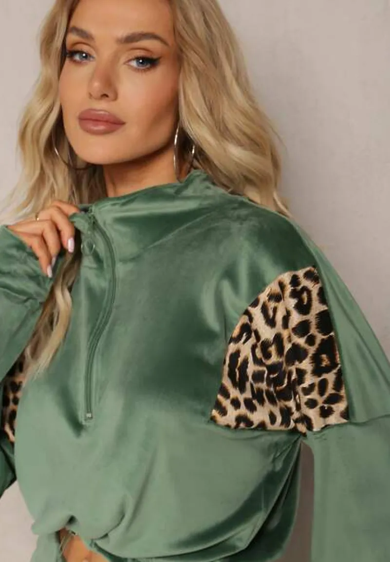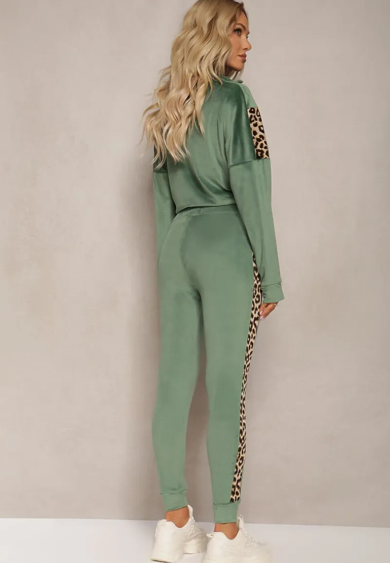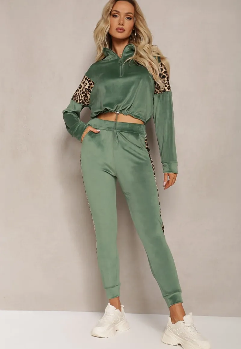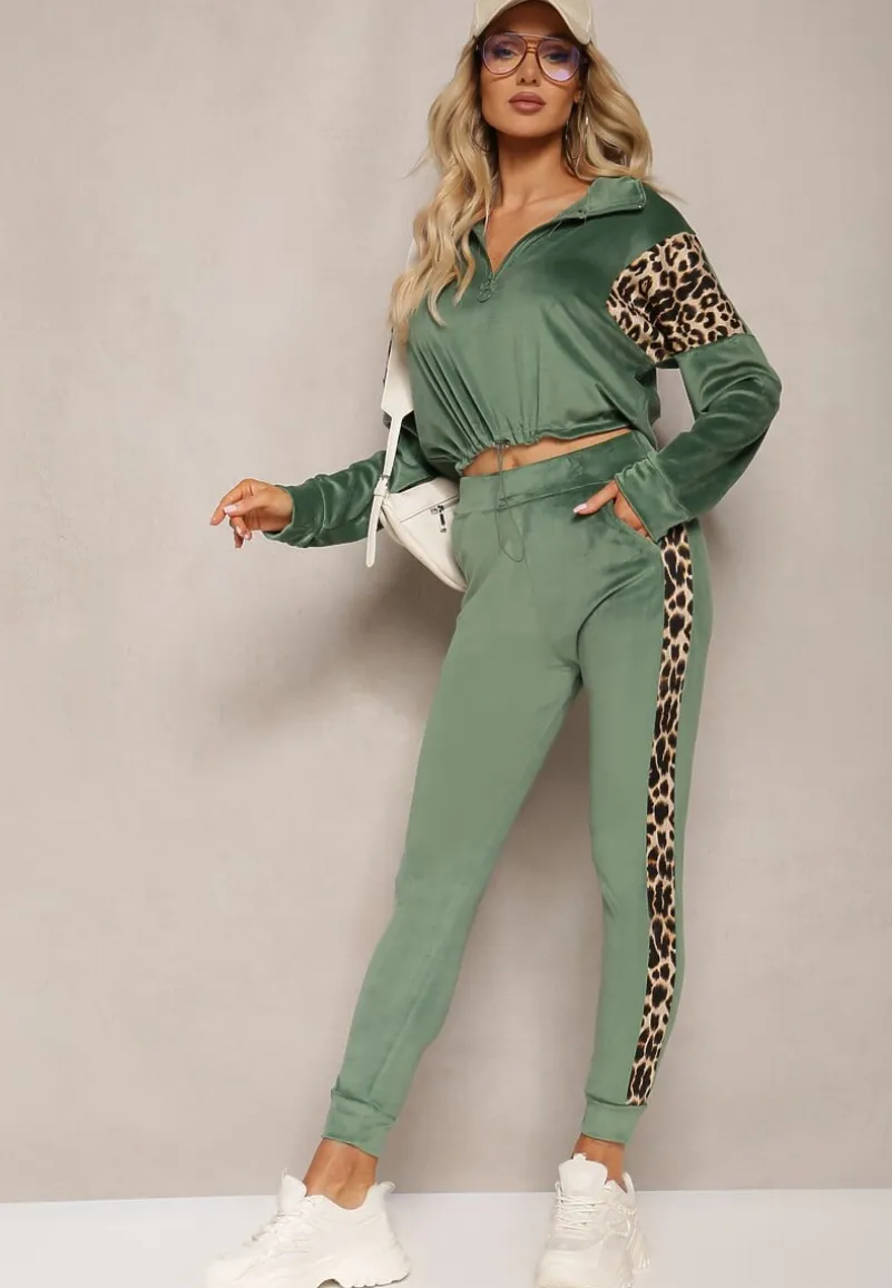 Komplet dresowy w nowoczesnym wydaniu z welurowej dzianiny z panterkowymi wstawkami. Bluza zapinana przy dekolcie na zamek błyskawiczny, na dole ściągana gumką ze stoperem. Spodnie z gumką w pasie, posiadają wsuwane kieszenie.