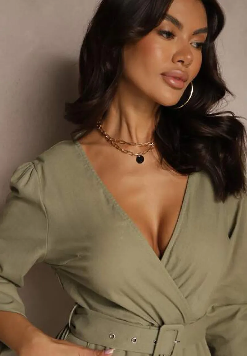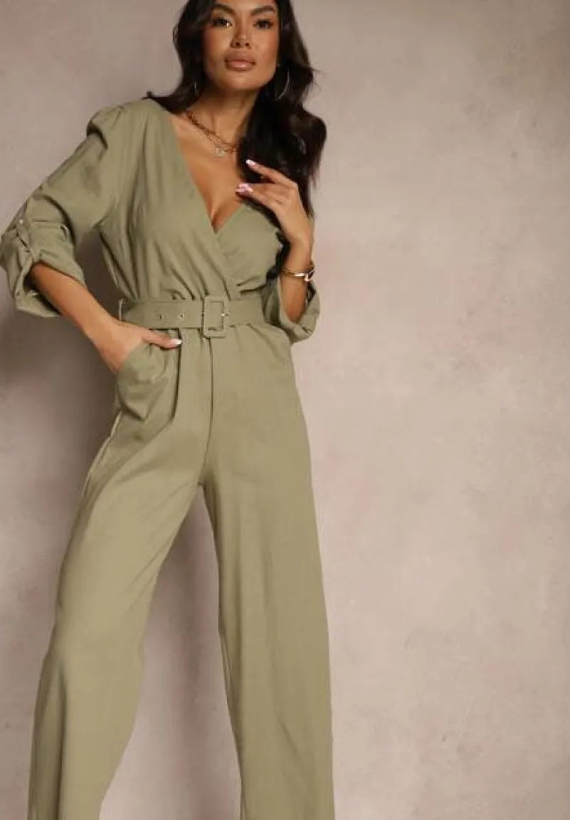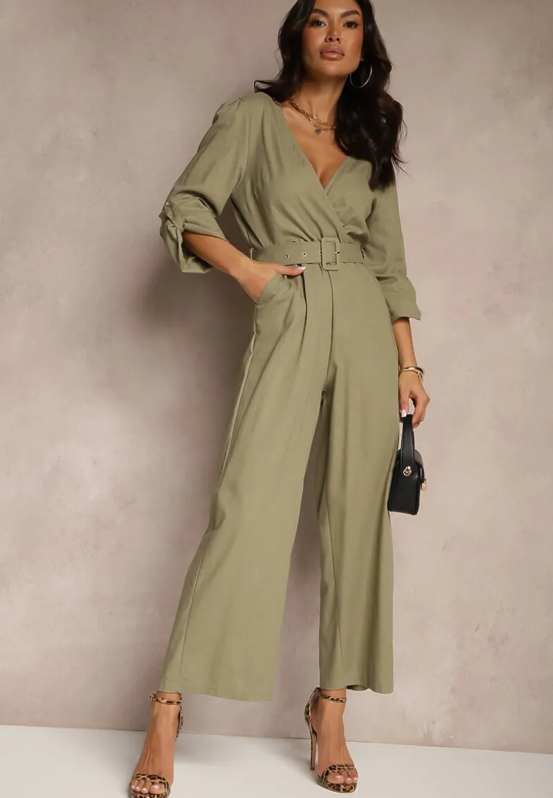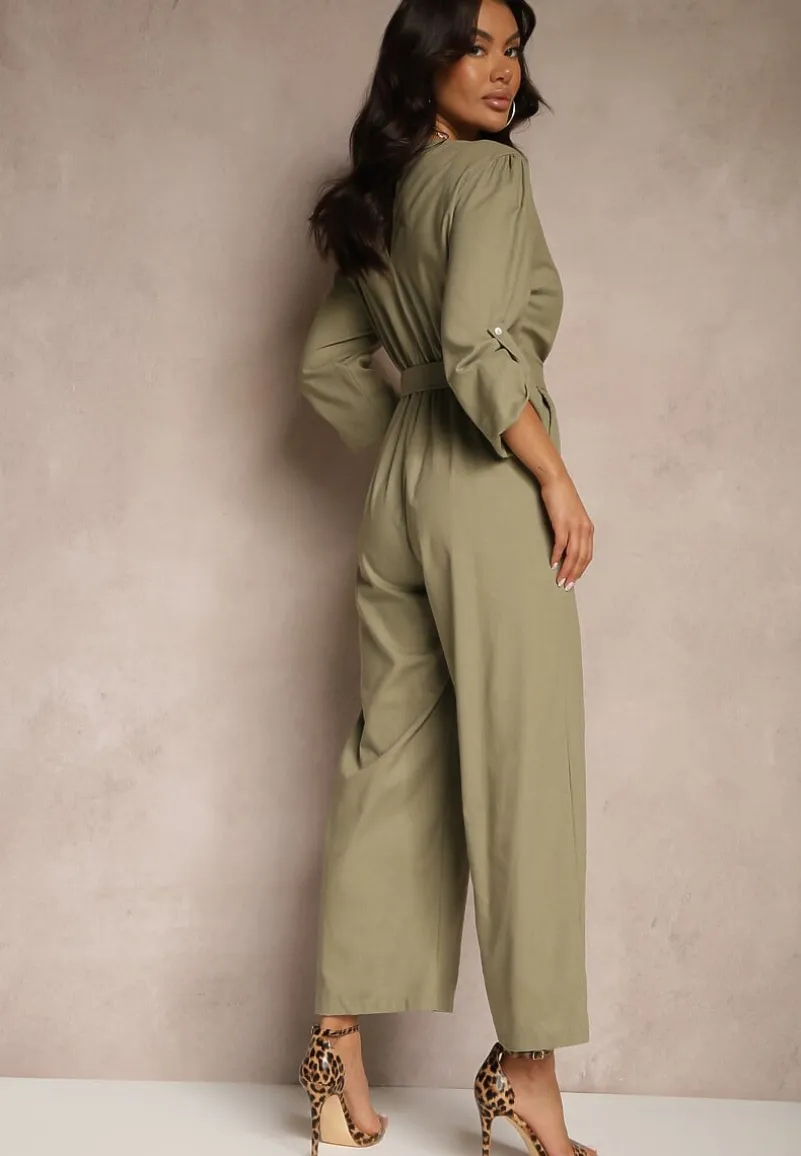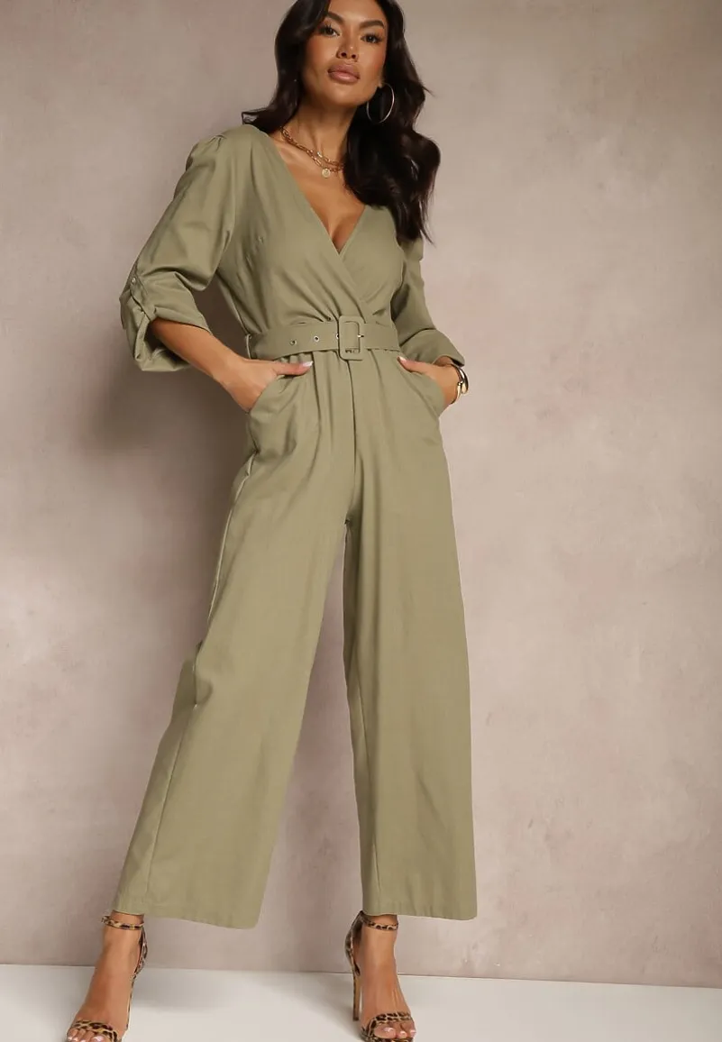 Zielony Kopertowy Kombinezon z Bawełny z Dodatkowym Paskiem i Gumką w Talii Rinnarela