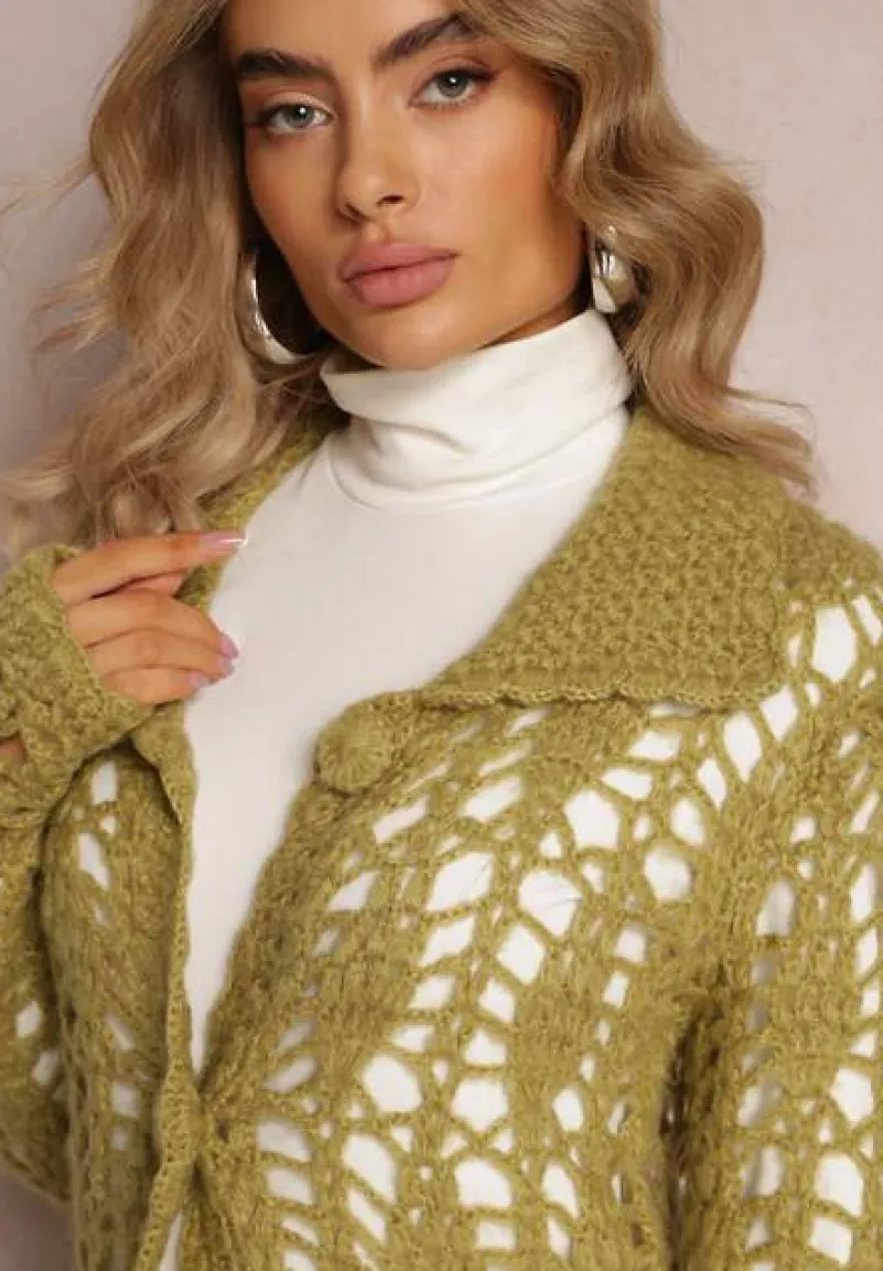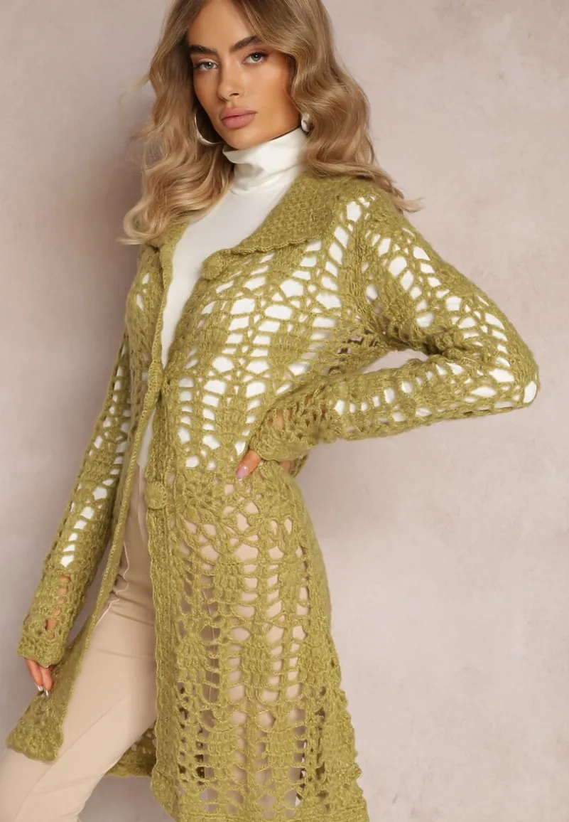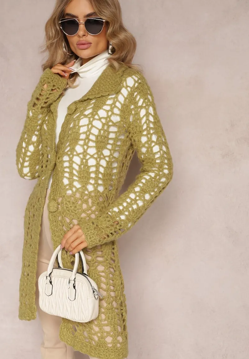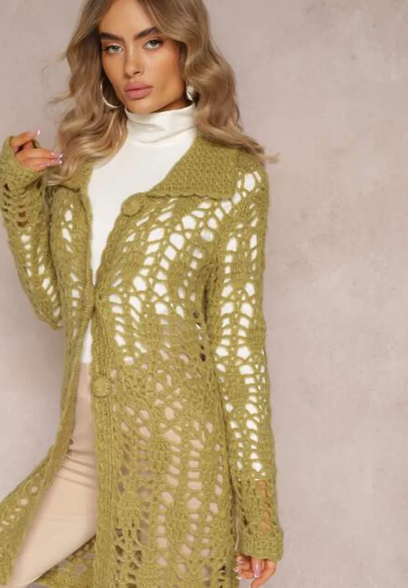 Kardigan Sieneos o luźnym i przedłużonym kroju. Zapinany z przodu na rząd guzików. Model wykonany z ażurowej tkaniny.