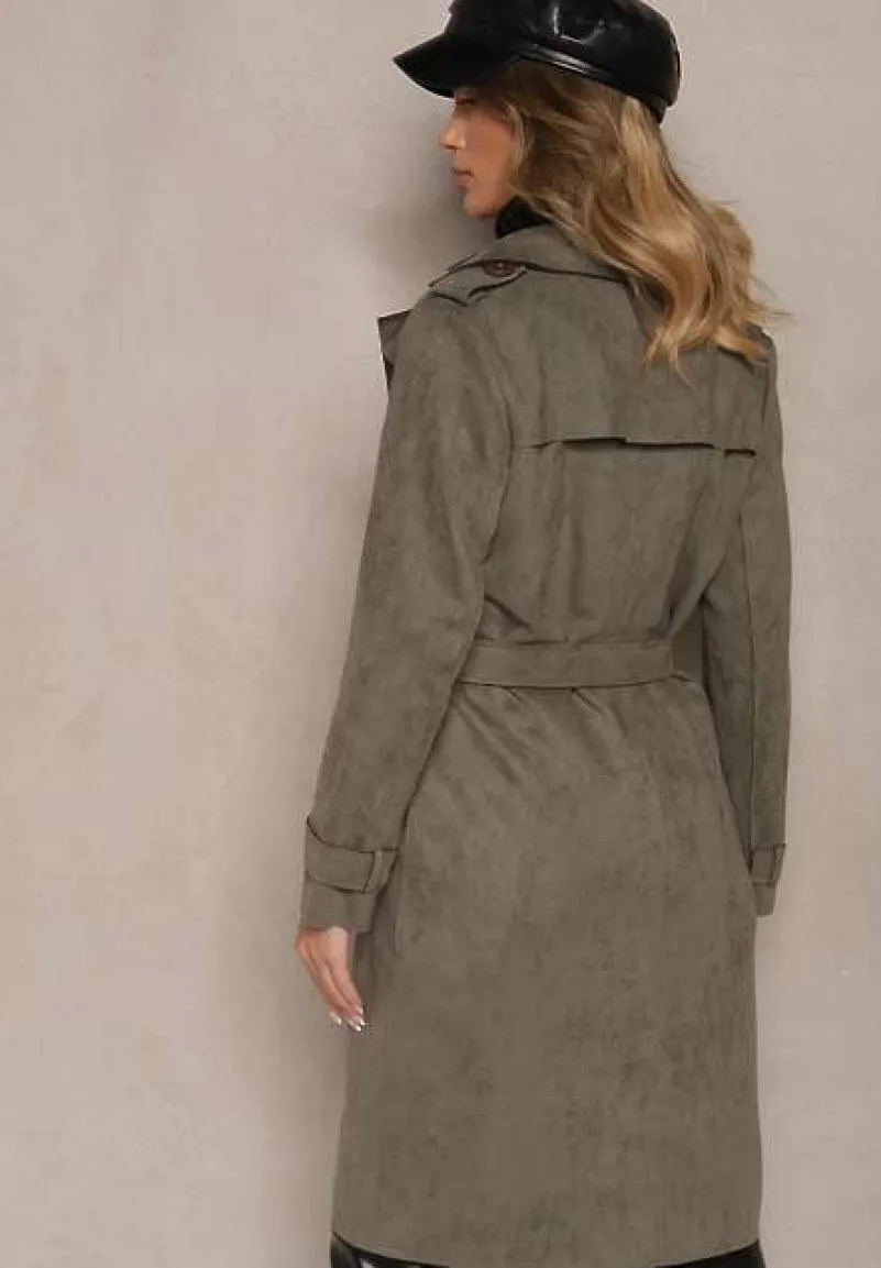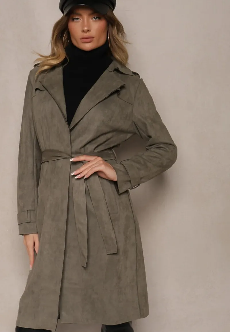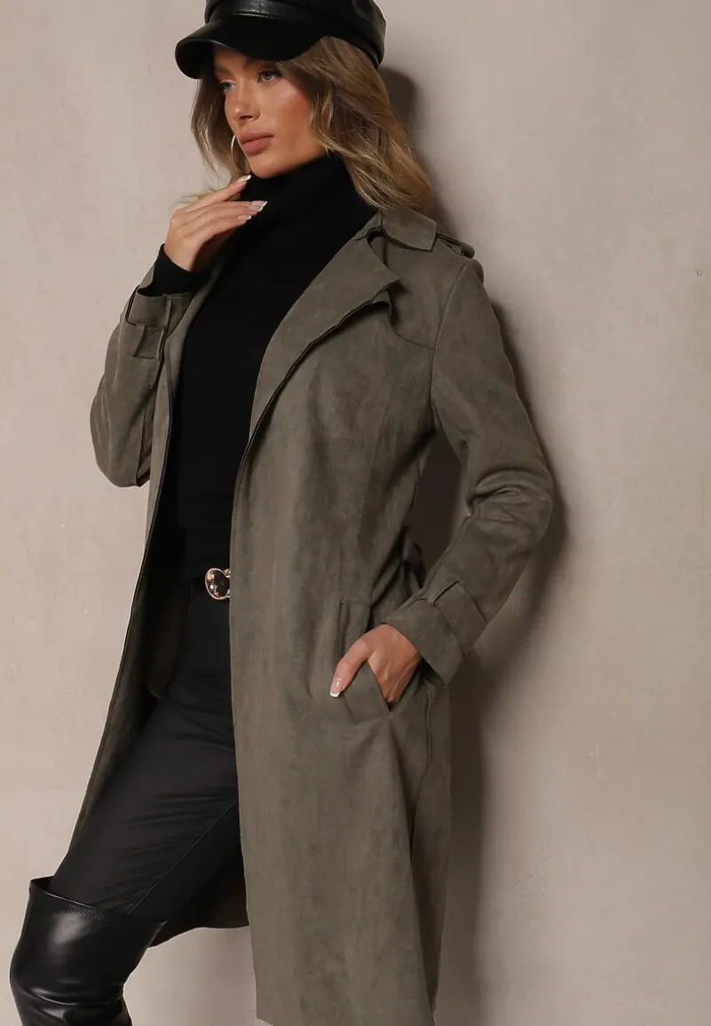 Płaszcz Usinlenne o szlafrokowym kroju i długości midi, z ozdobnymi pagonami na ramionach. Wiązany na szeroki, pasujący pasek w talii. Z podwójnie wykładanym kołnierzem oraz dekoracyjną, opadającą klapą przy obojczyku z przodu oraz na plecach. Z długimi rękawami zakończonymi paskiem. Na wysokości bioder znajdują się wsuwane kieszenie. Płaszcz Usinlenne łączy w sobie formalny i casualowy styl.