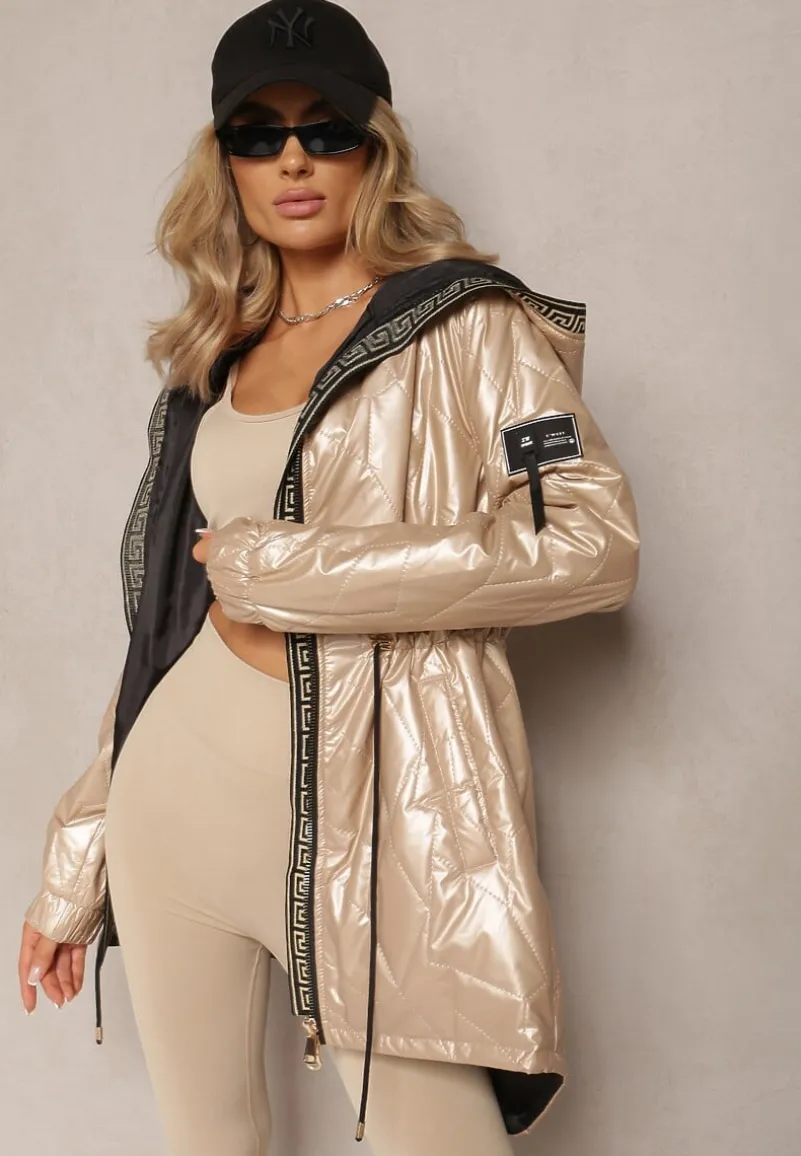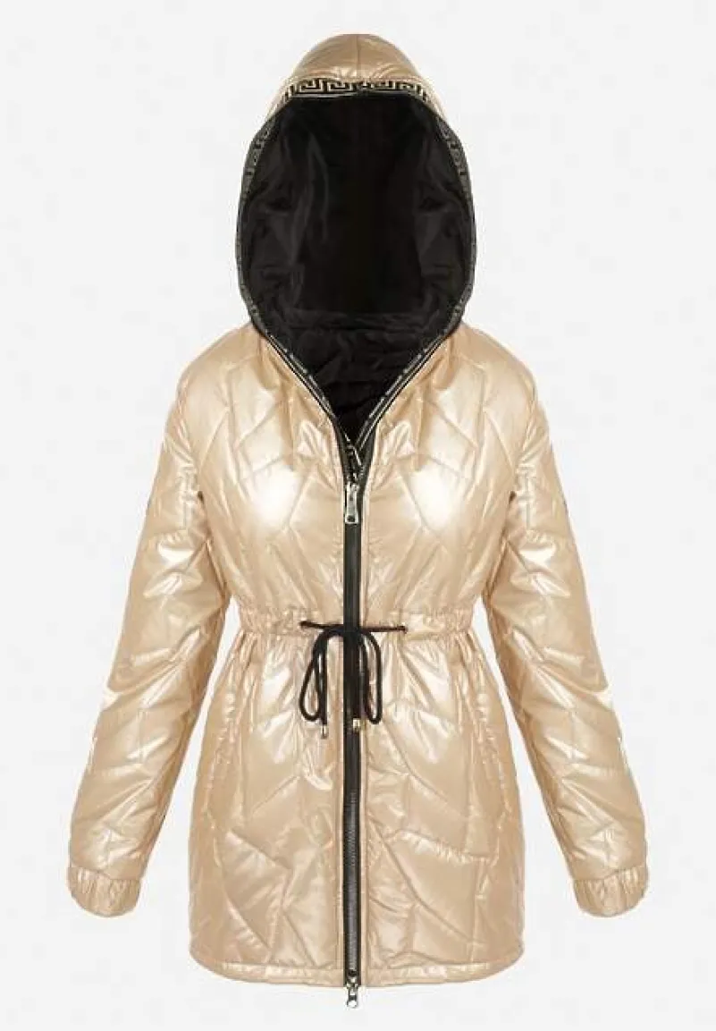 Kurtka Diomasio z pikowanego, metalicznego materiału. Zapinana na zamek błyskawiczny, długie rękawy zakończone są elastycznym ściągaczem dla zabezpieczenia przed zimnem. Kaptur nie jest odpinany. Boczne kieszenie kurtki wsuwane. W pasie wszyto sznurek do ściągania. Lekko ocieplona. To przejściowy model w nowoczesnym stylu, który kochają influencerki na świecie.