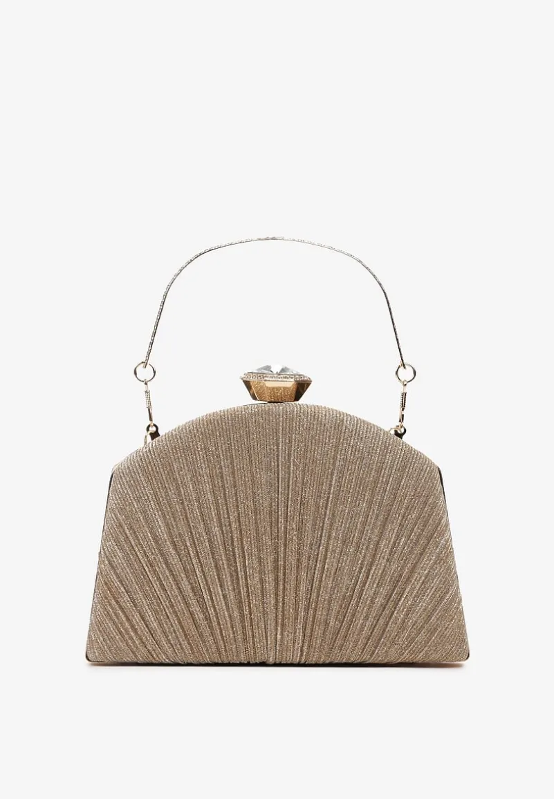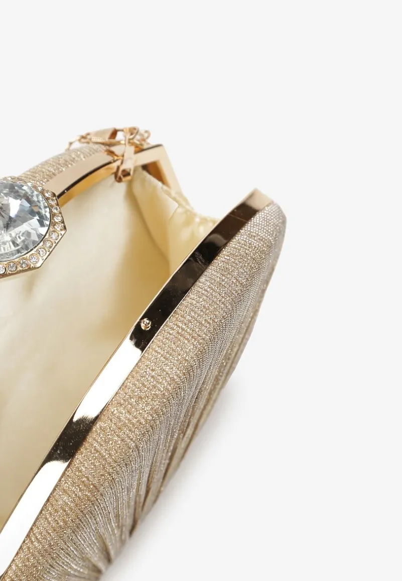 Elegancka torebka wieczorowa w stylu retro z kryształkowym zatrzaskiem, dodatkowo ozdobiona brokatem i marszczeniem. Do torebki dołączony łańcuszek.