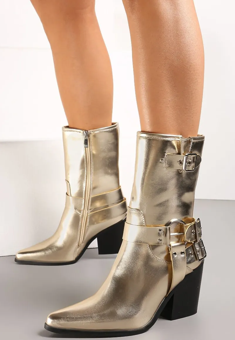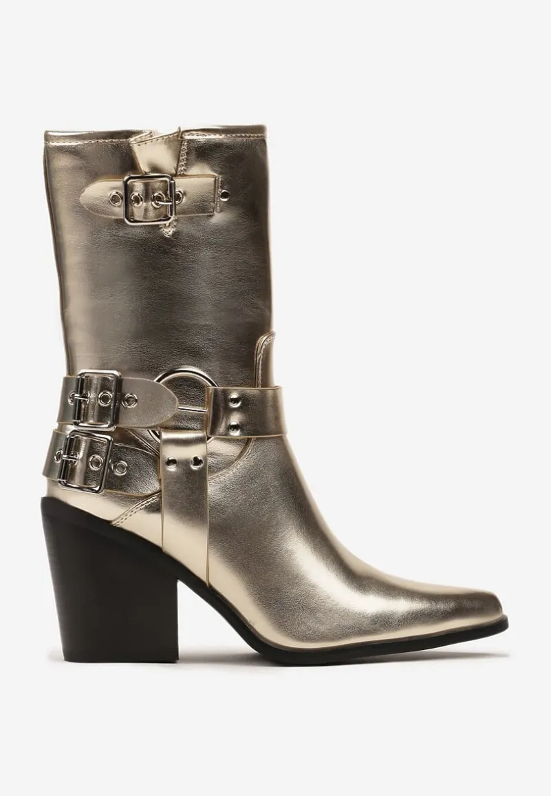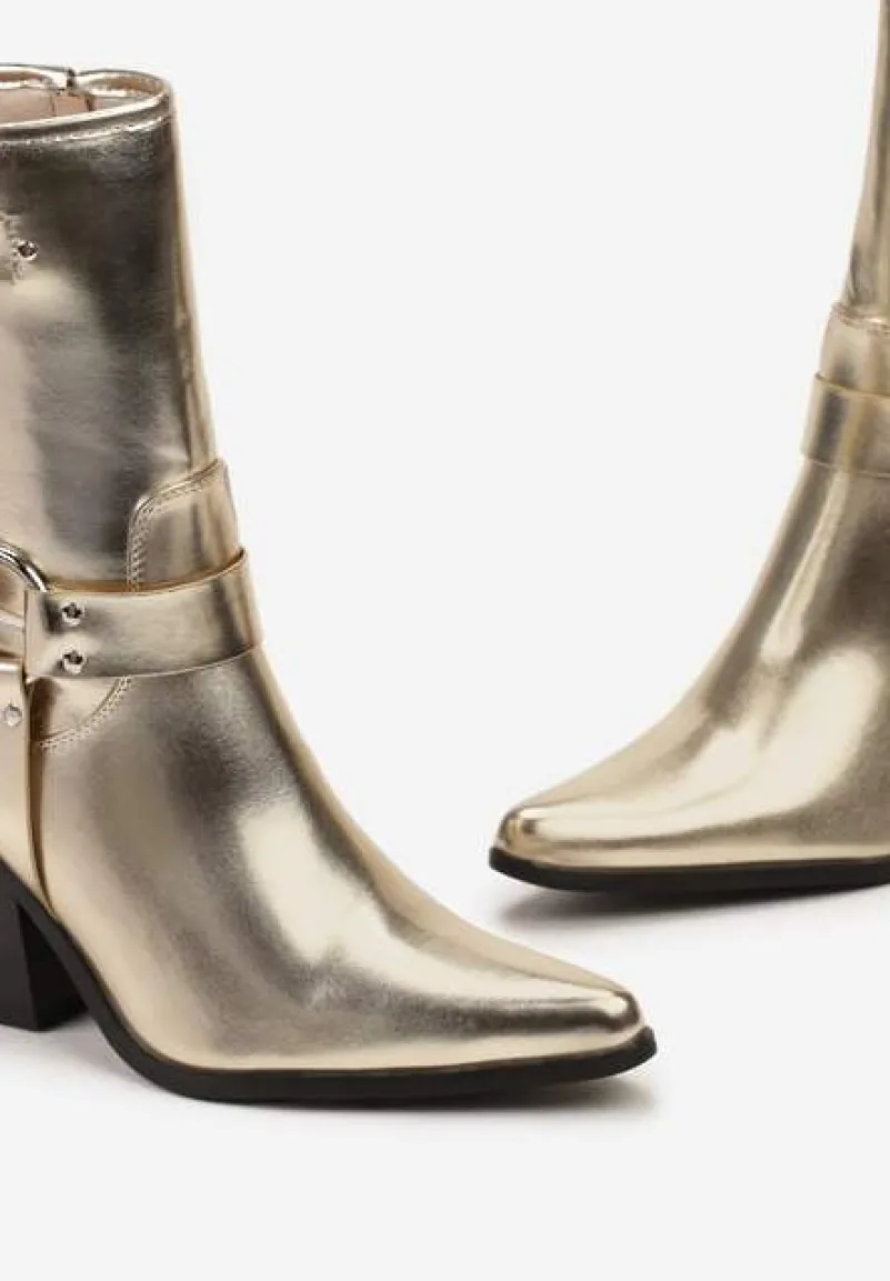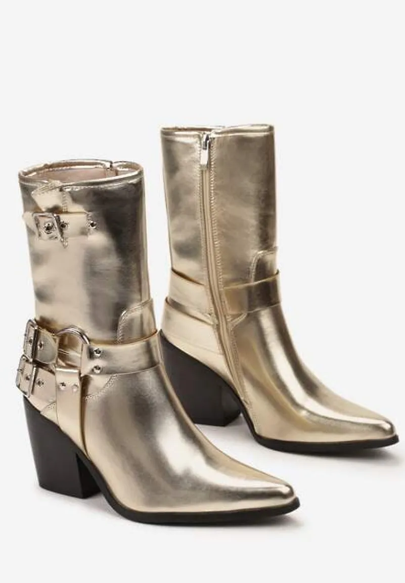 Botki kowbojki Caraley z ozdobnymi klamrami i noskiem w szpic. Osadzone na ściętym słupku. Rewelacyjnie się prezentują w połączeniu z kurtką biker.