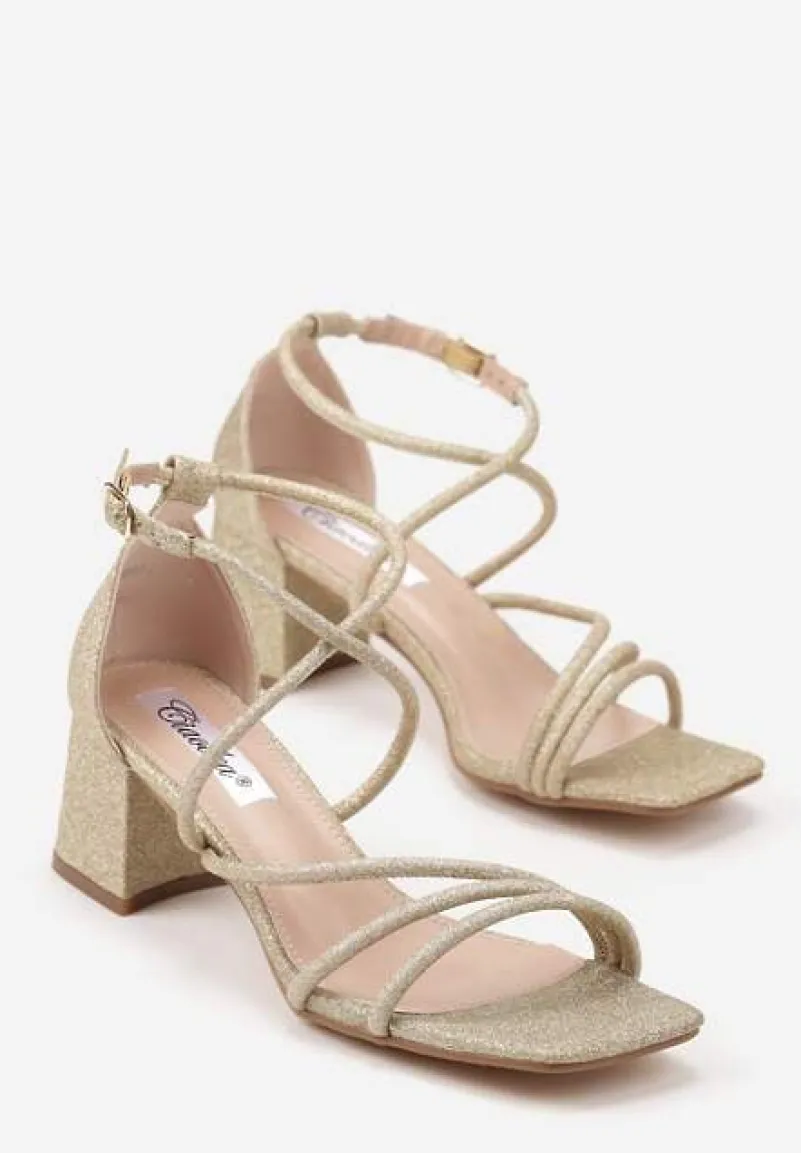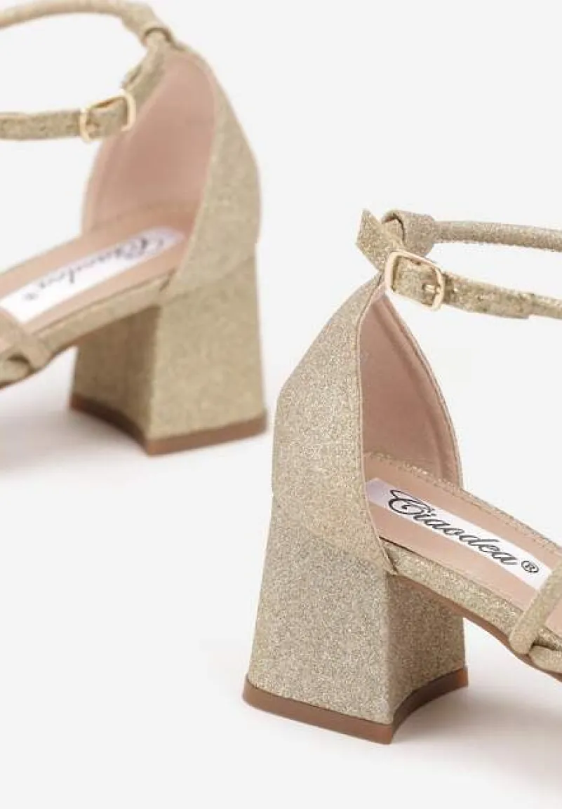 Złote Brokatowe Sandały na Słupkowym Obcasie Dollinea