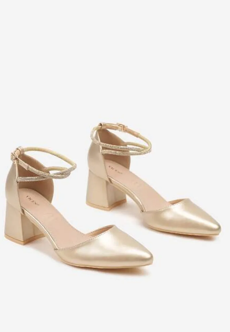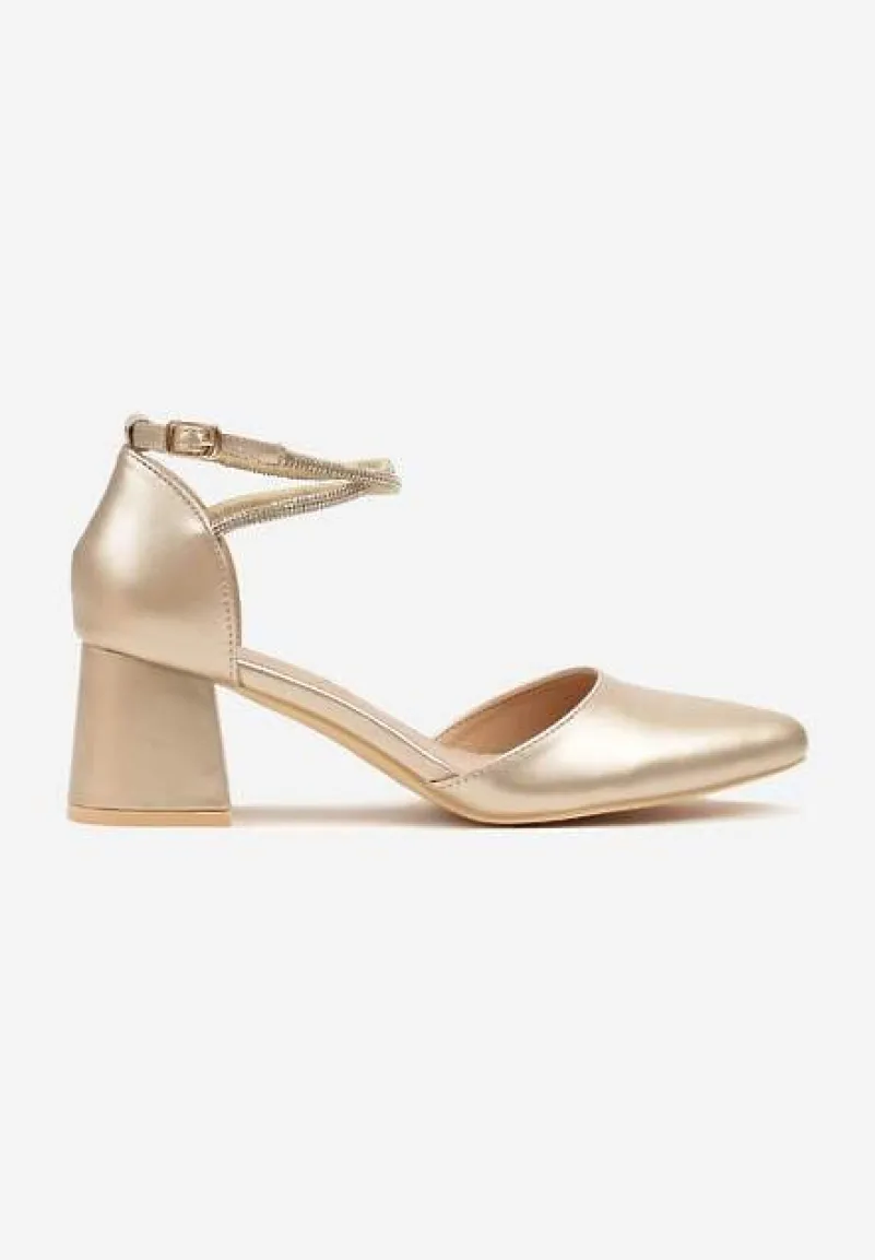 Złote Czółenka Vices na Słupku z Wkładką ze Skóry Naturalnej i Paskami z Cyrkoniami Riastella