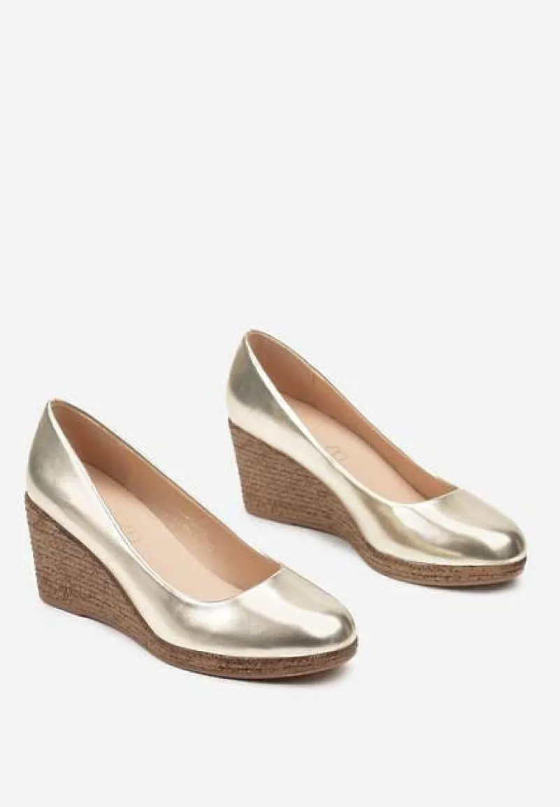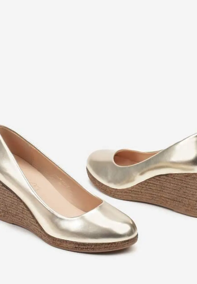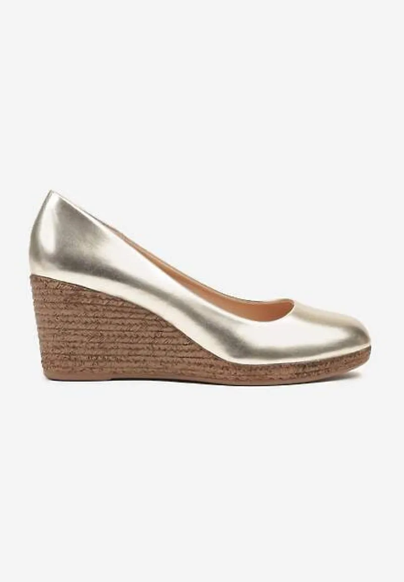 Klasyczne czółenka z ekozamszu osadzone na koturnie z lekko połyskującą plecionką i skórzaną wkładką. Będą doskonałym wyborem do stylizacji ze spódnicą ołówkową lub garniturowym kompletem.