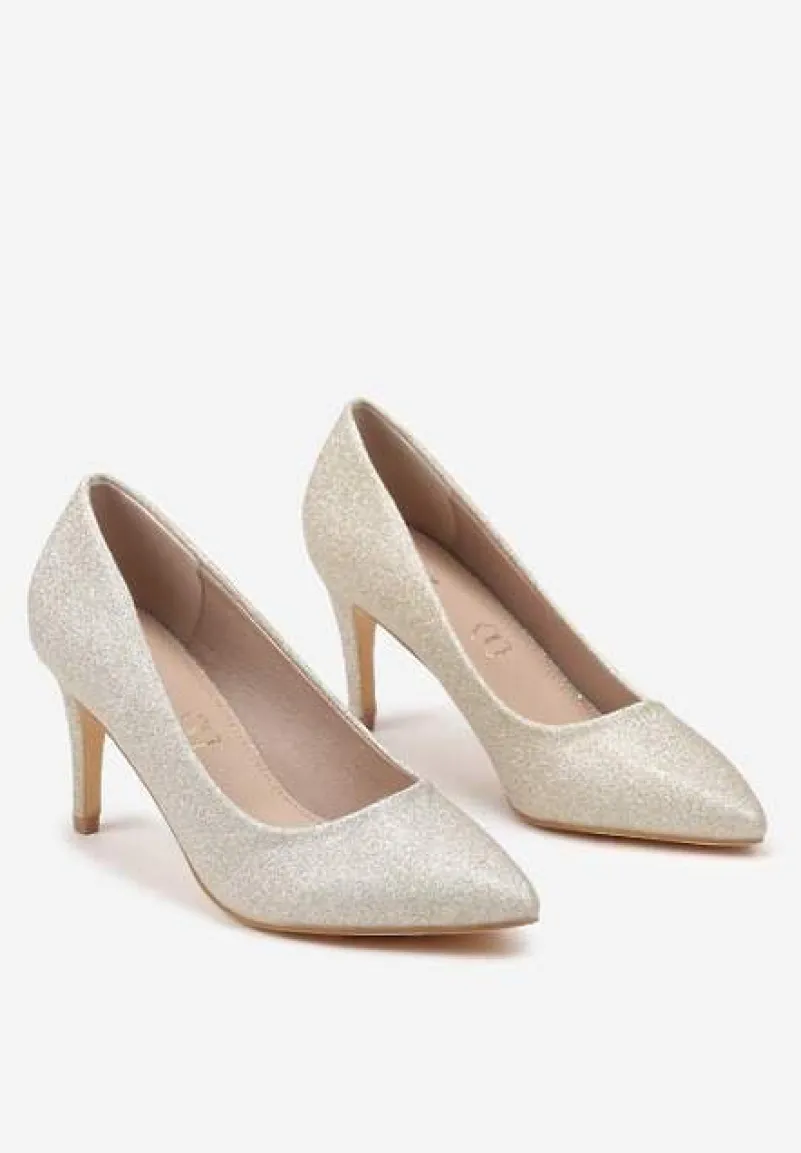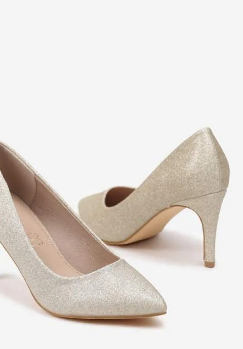 Złote Eleganckie Czółenka Vices na Szpilce z Brokatem i Wkładką ze Skóry Naturalnej Sarinna