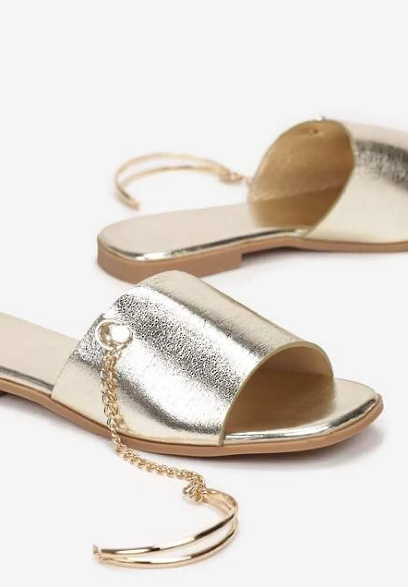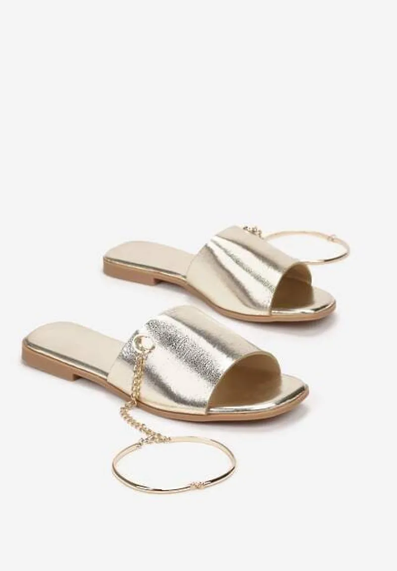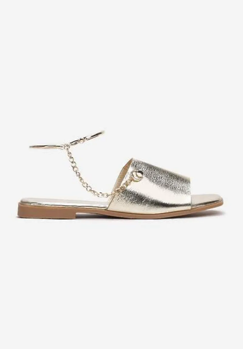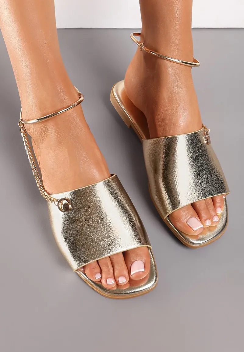 Klapki Peilaeno wsuwane, odkryte na kwadratowym nosku. Z szerokim paskiem między palcami a śródstopiem. Przy nim znajduje się zaczepiony łańcuch w odcieniu złota, który trzyma stopę przy pięcie. Zapinany jest na karabińczyk. Wykonane z ekoskóry. Cenisz sobie wygodę i minimalizm, a jednocześnie śledzisz na bieżąco trendy? Pokochasz te klapki!