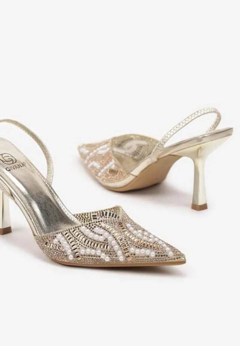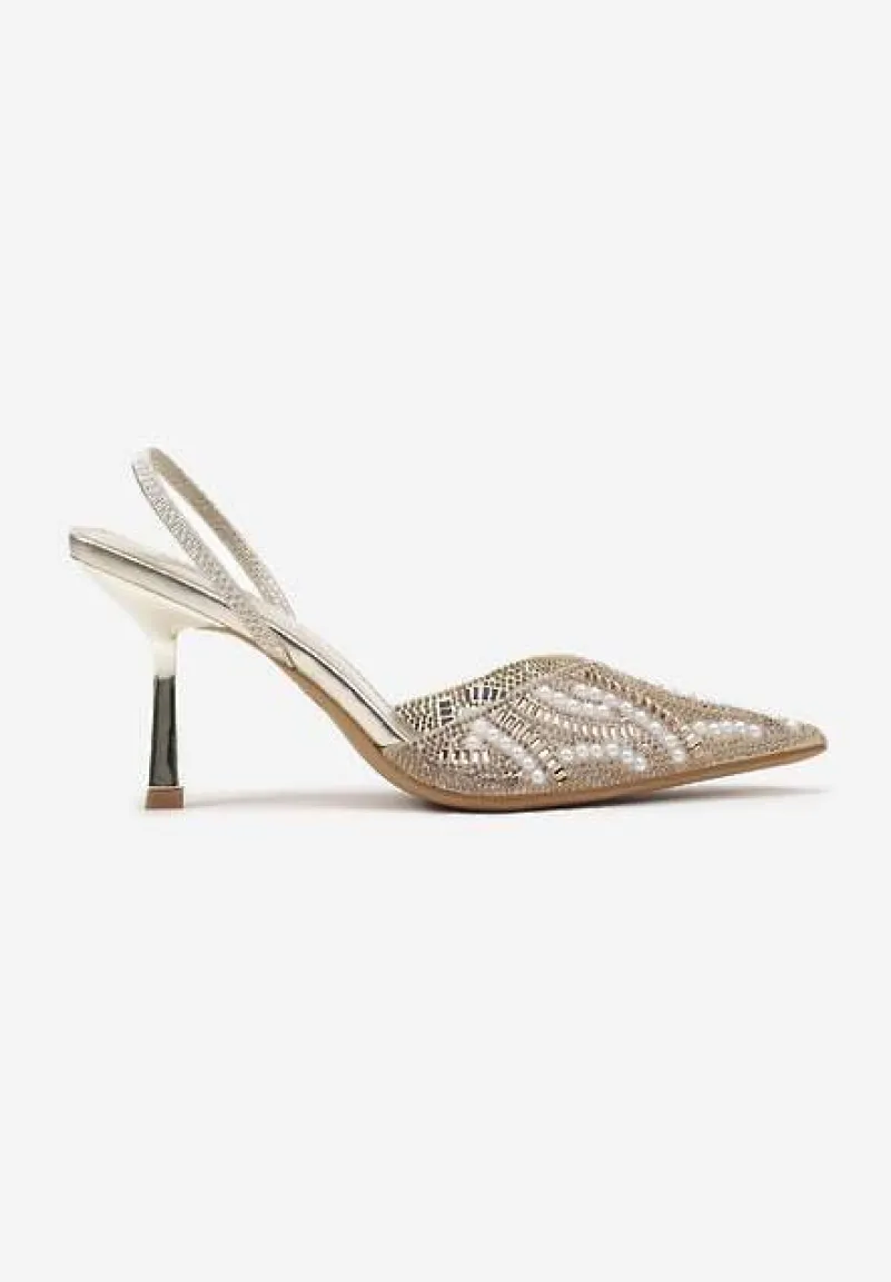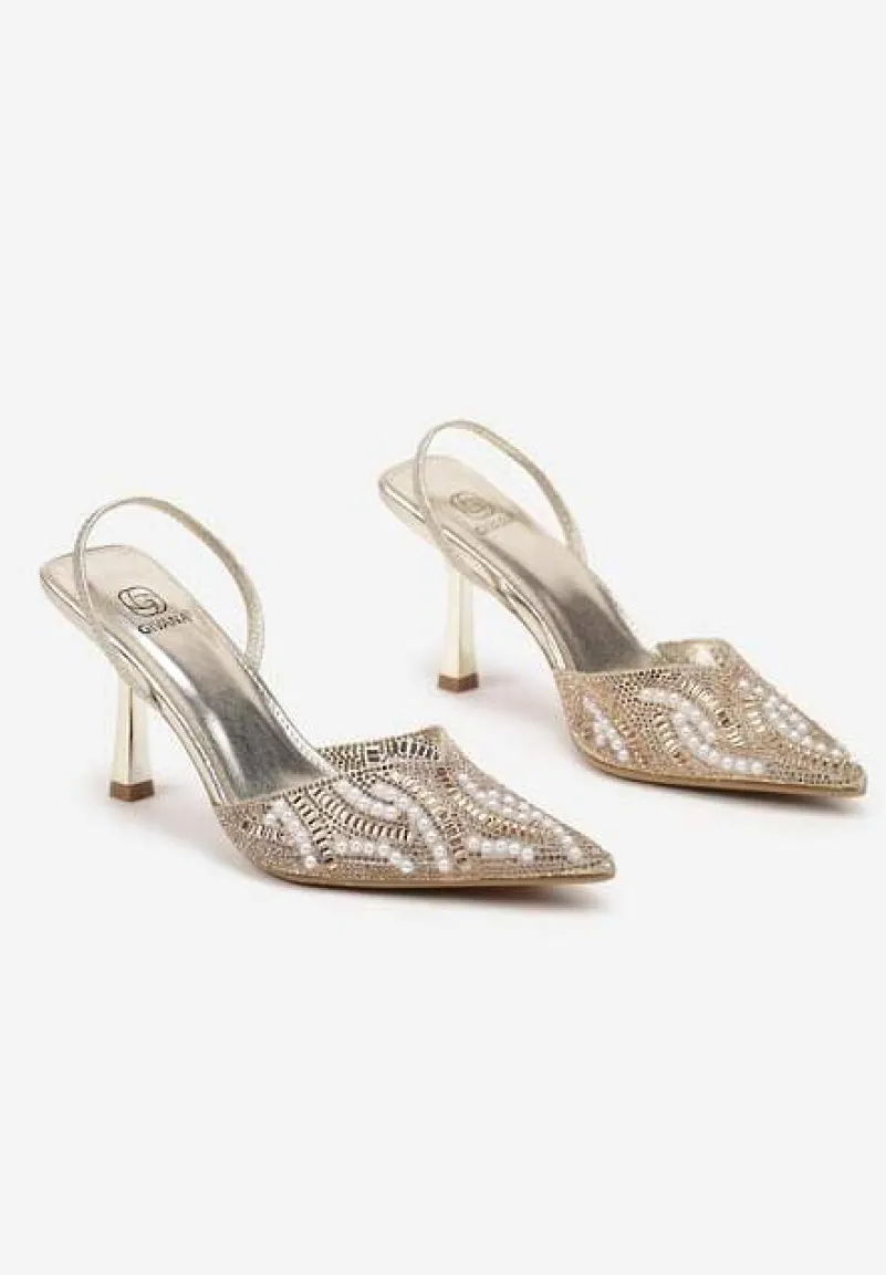 Złote Plecione Sandały Szpilki ze Szpiczastym Noskiem Zdobione Perłami Gonnara