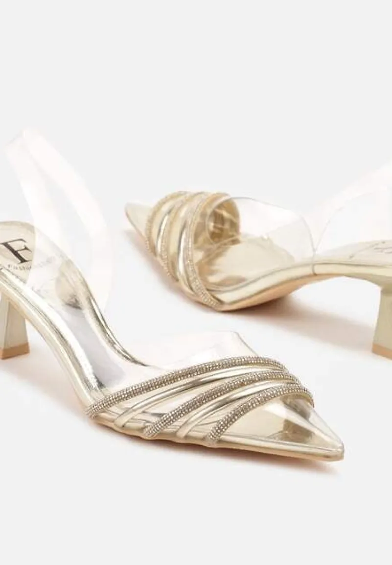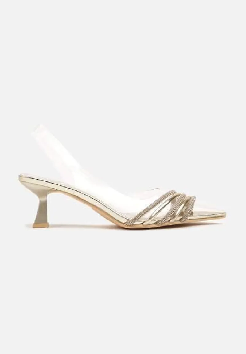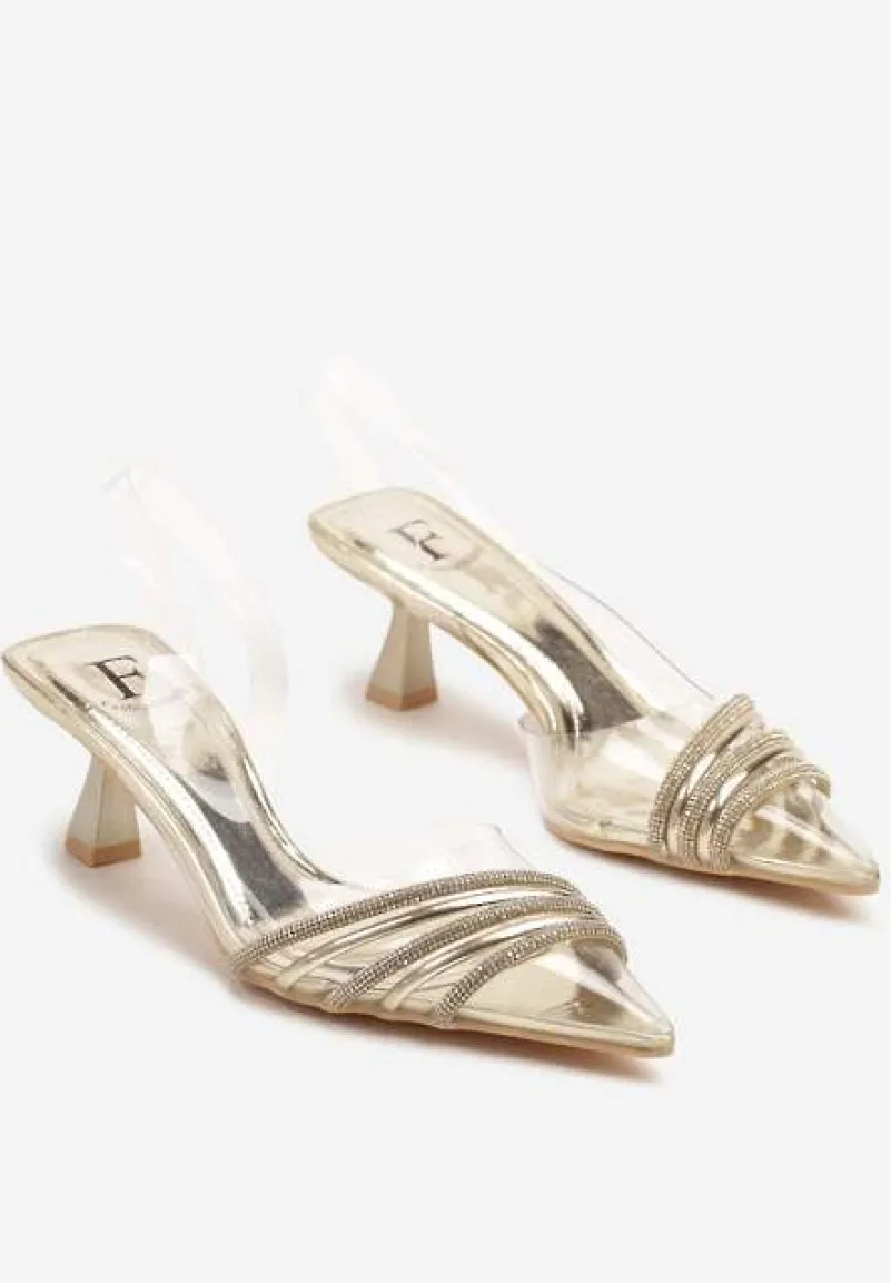 Złote Przezroczyste Sandały na Szpilce Kaczuszce z Cyrkoniami Finretia