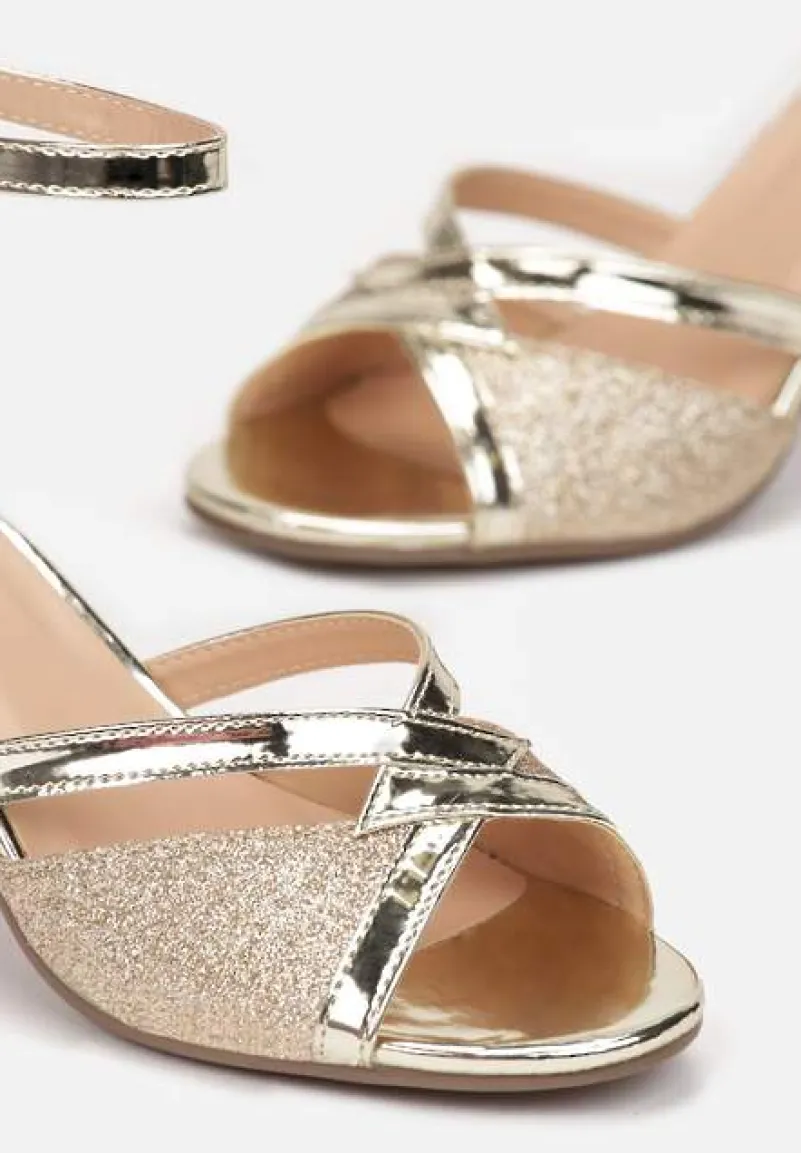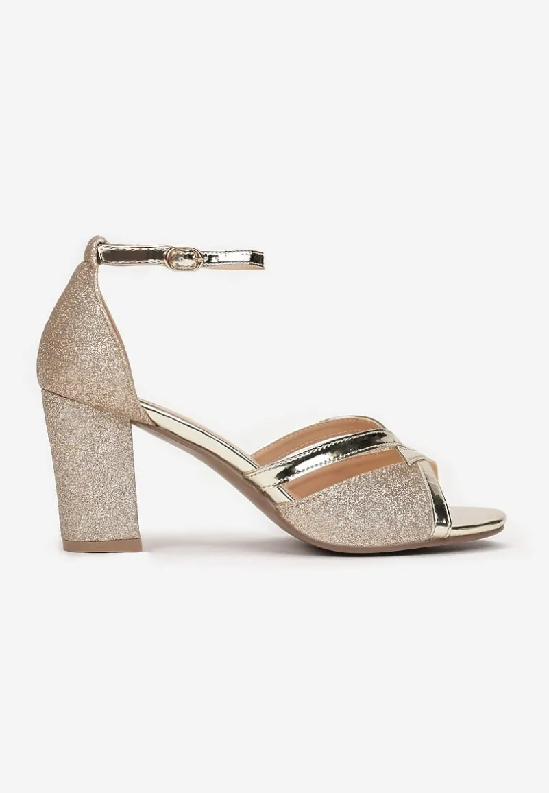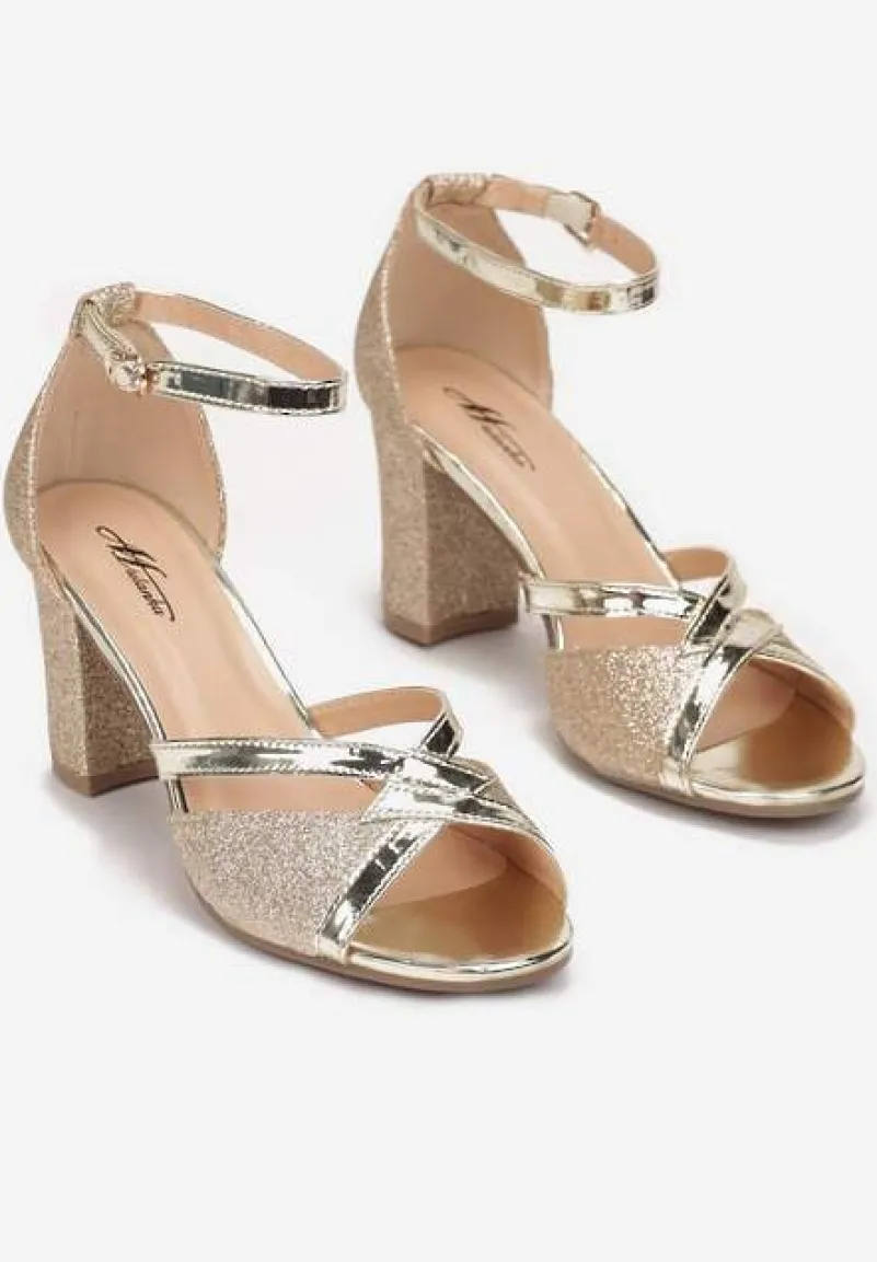 Sandały Layo brokatowe, zdobione lakierowanymi wstawkami. Całość wykonane ze skóry ekologicznej. Odkryty, okrągły nosek z paskiem podtrzymującym stopę. Osadzone na słupku. Zapinane wokół kostki na sprzączkę.