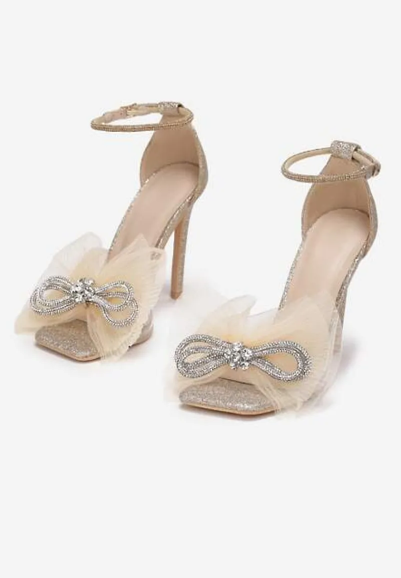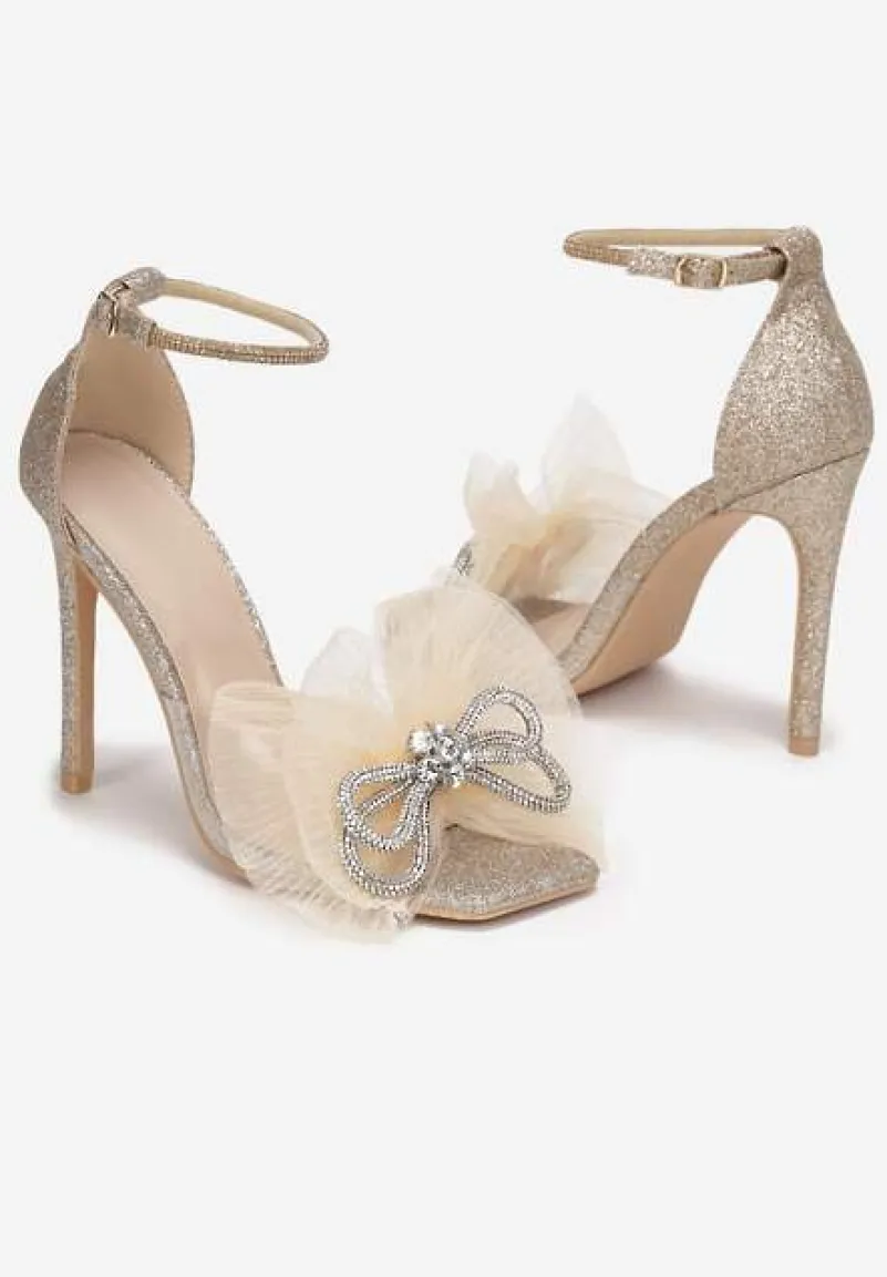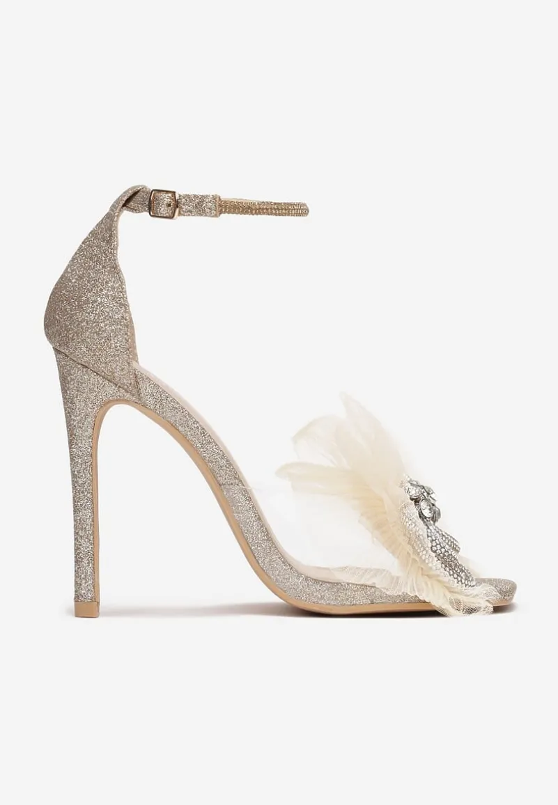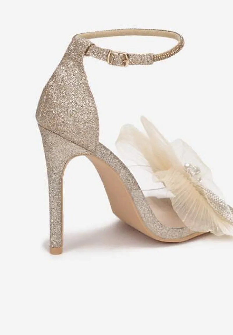 Sandały Iomastis pokryte brokatem, z eleganckim, kwadratowym noskiem. Osadzone na wysokiej, cienkiej szpilce. Przy palcach transparentny pasek dekorowany efektowną kokardą z ozdobą wysadzaną imitacją cyrkonii. Przy kostce zapięcie na sprzączkę. Sandały Iomastis ożywią nawet najbardziej minimalistyczne outfity, dodając im blasku i zmysłowości!