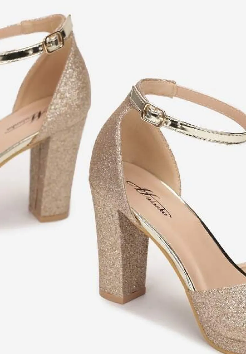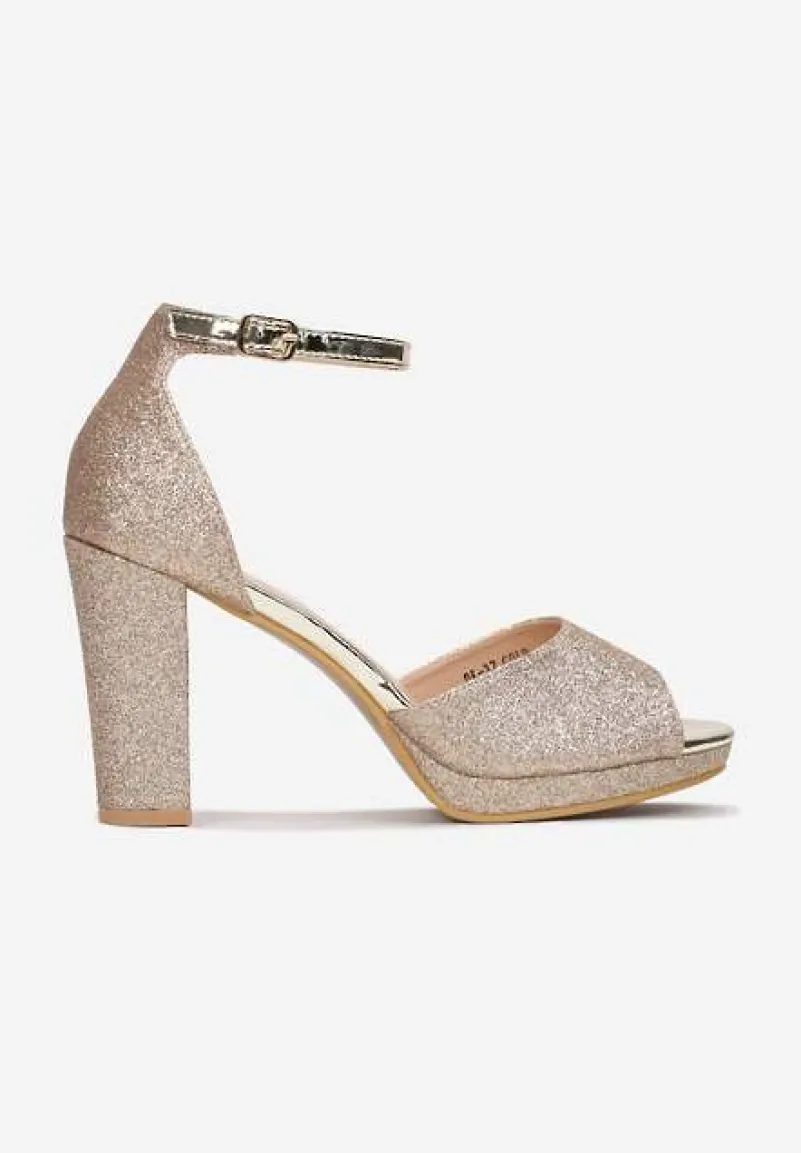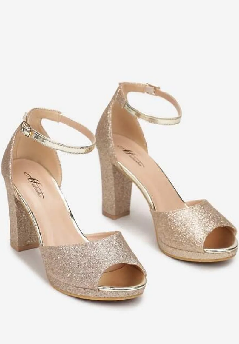 Złote Sandały na Słupkowym Obcasie z Brokatem Sconis
