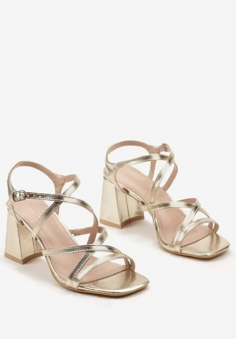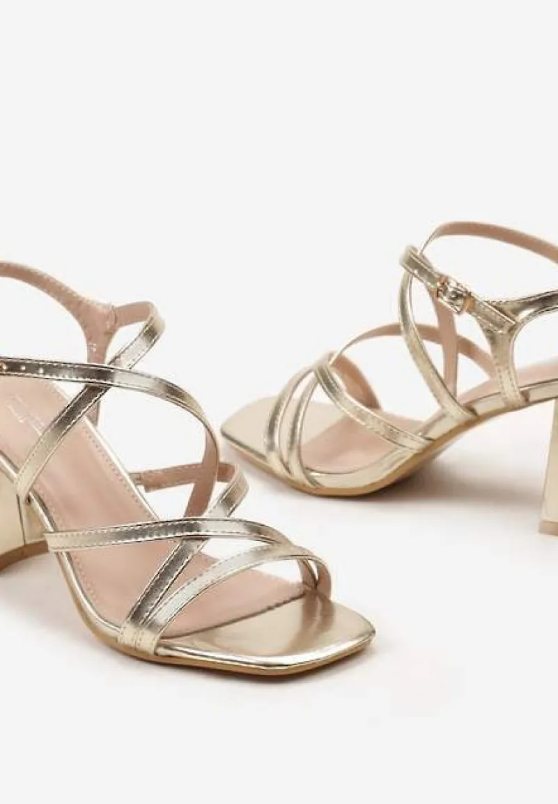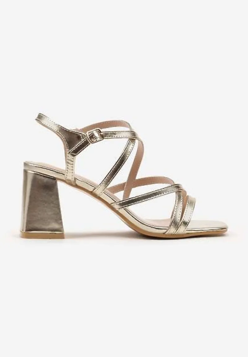Złote Sandały na Słupku Ozdobione Skrzyżowanymi Paskami Zapinane na Sprzączkę Mrines